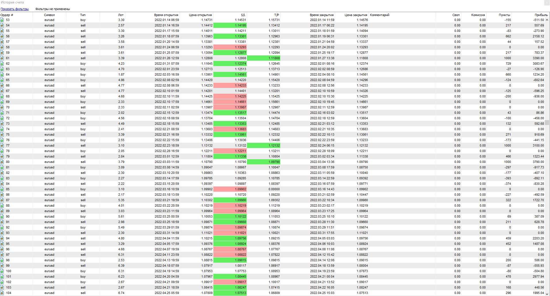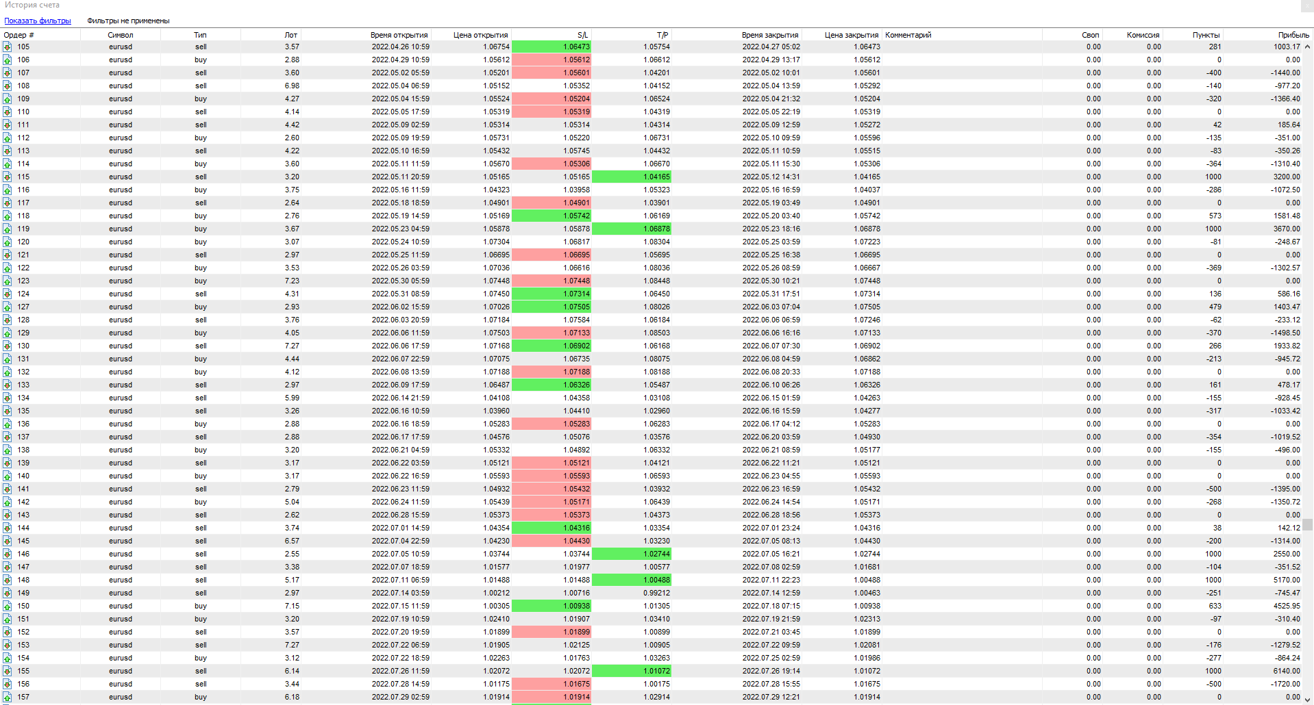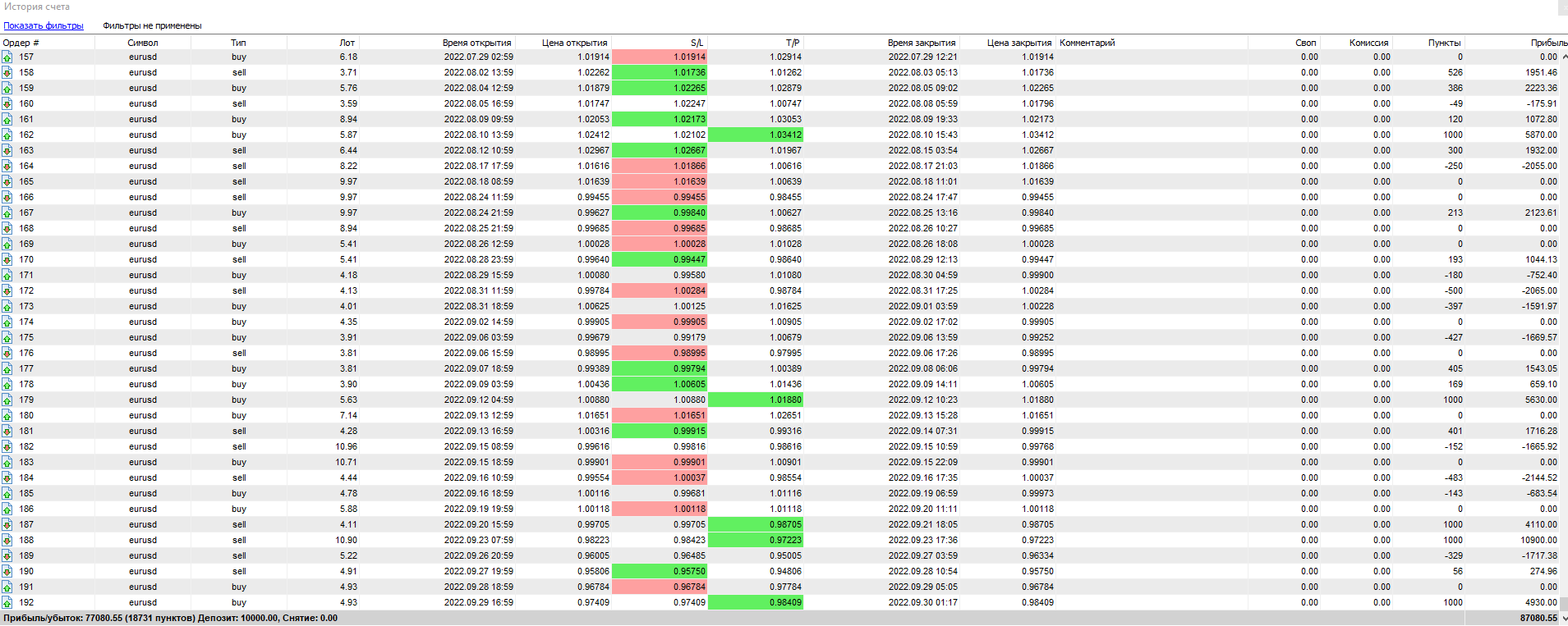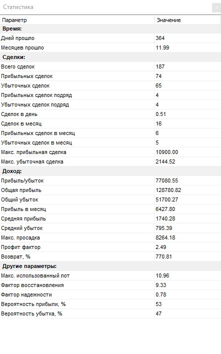 Всего за 12 месяцев тестирования ТС, было открыто сделок — 187. Из них закрыто с прибылью — всего 74. Убыточных — 65, остальные — закрыты в «ноль».