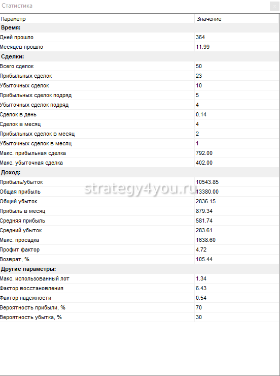 Всего сделок за 1 год на H1 интервале не много — всего 50. Прибыльных — 23. Убыточных — 10, остальные были закрыты по безубытку (в ноль).