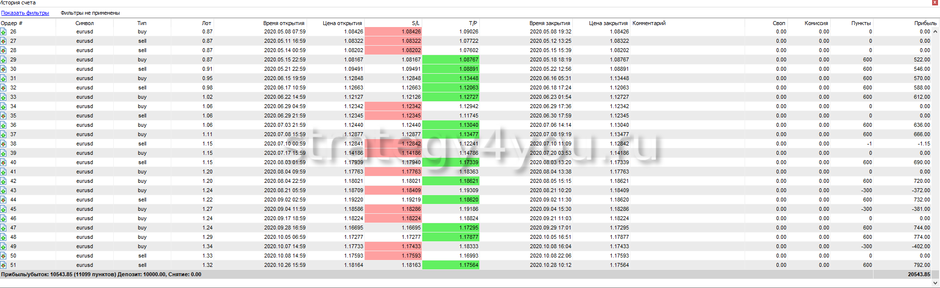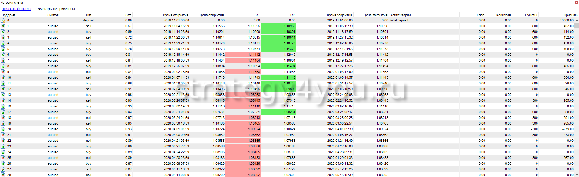 Подробный отчет по всем заключенным сделкам за период тестирования по этой торговой стратегии: