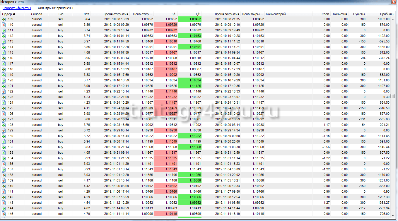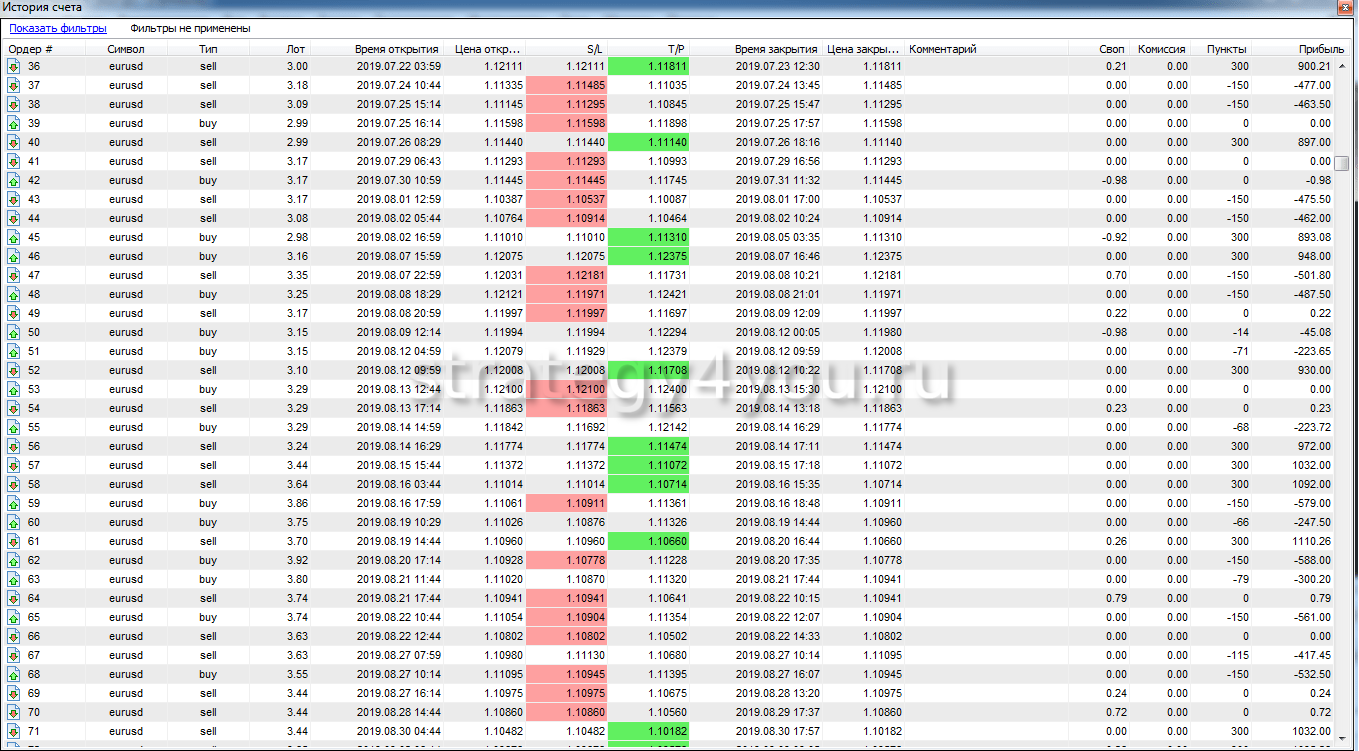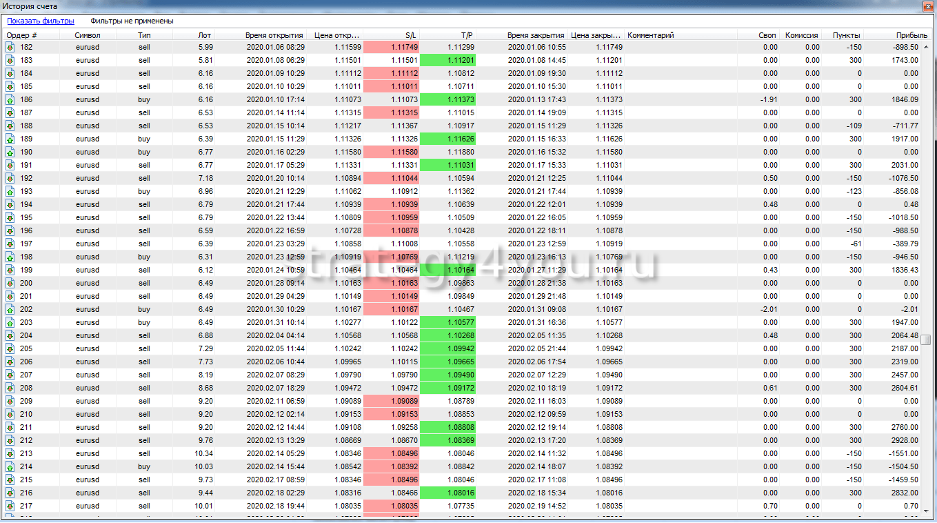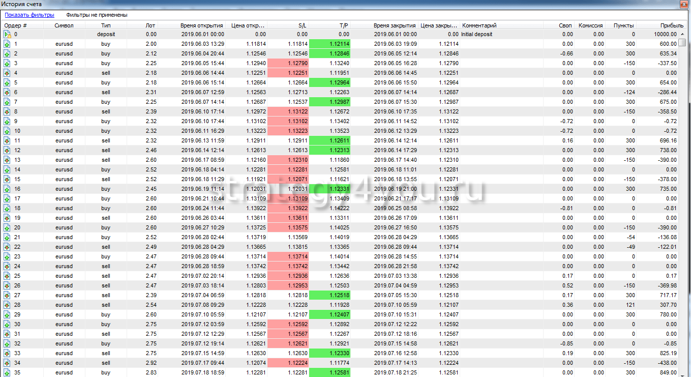 Так же публикуем для вас самый подробный отчет по всем сделкам за период тестирования торговой стратегии: