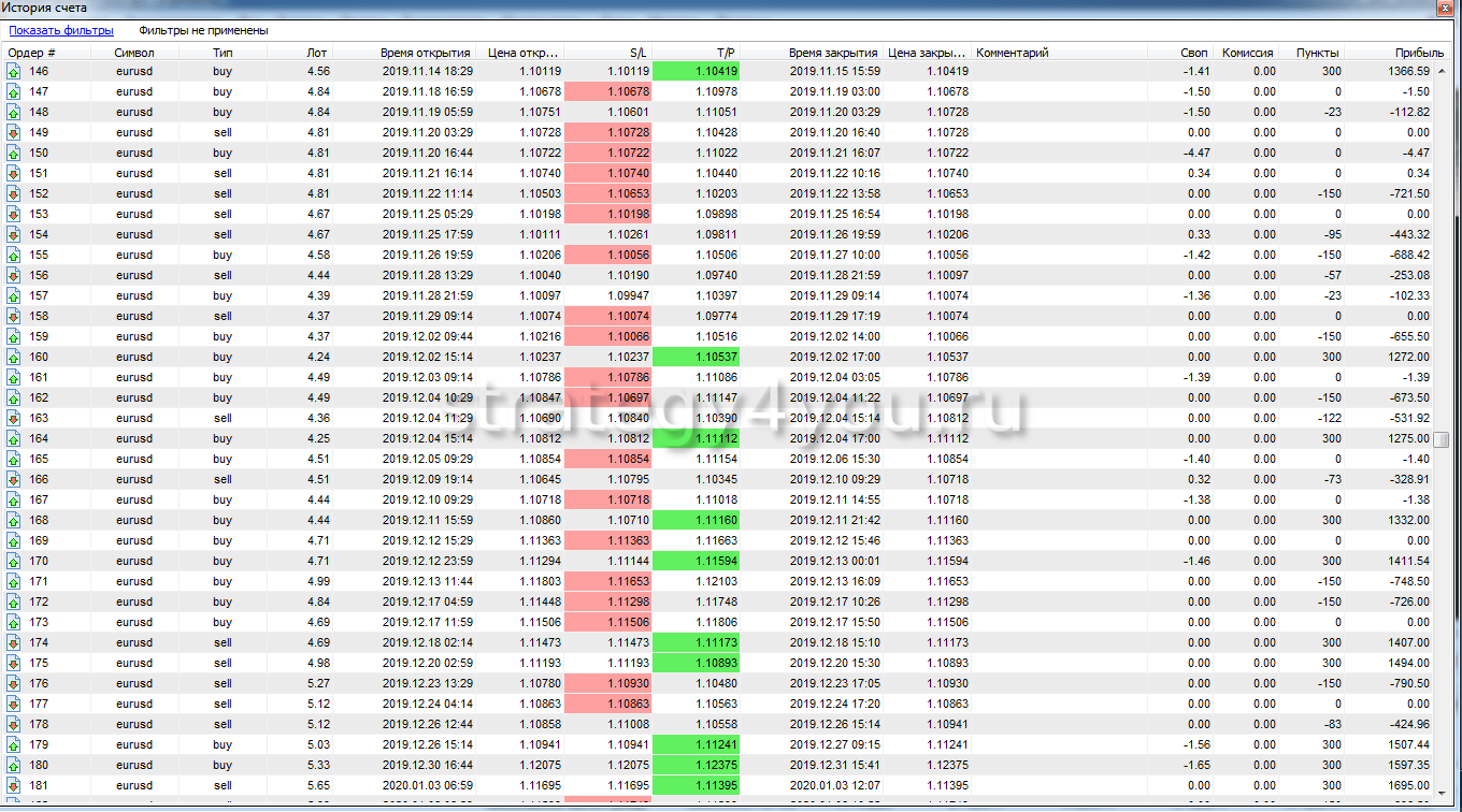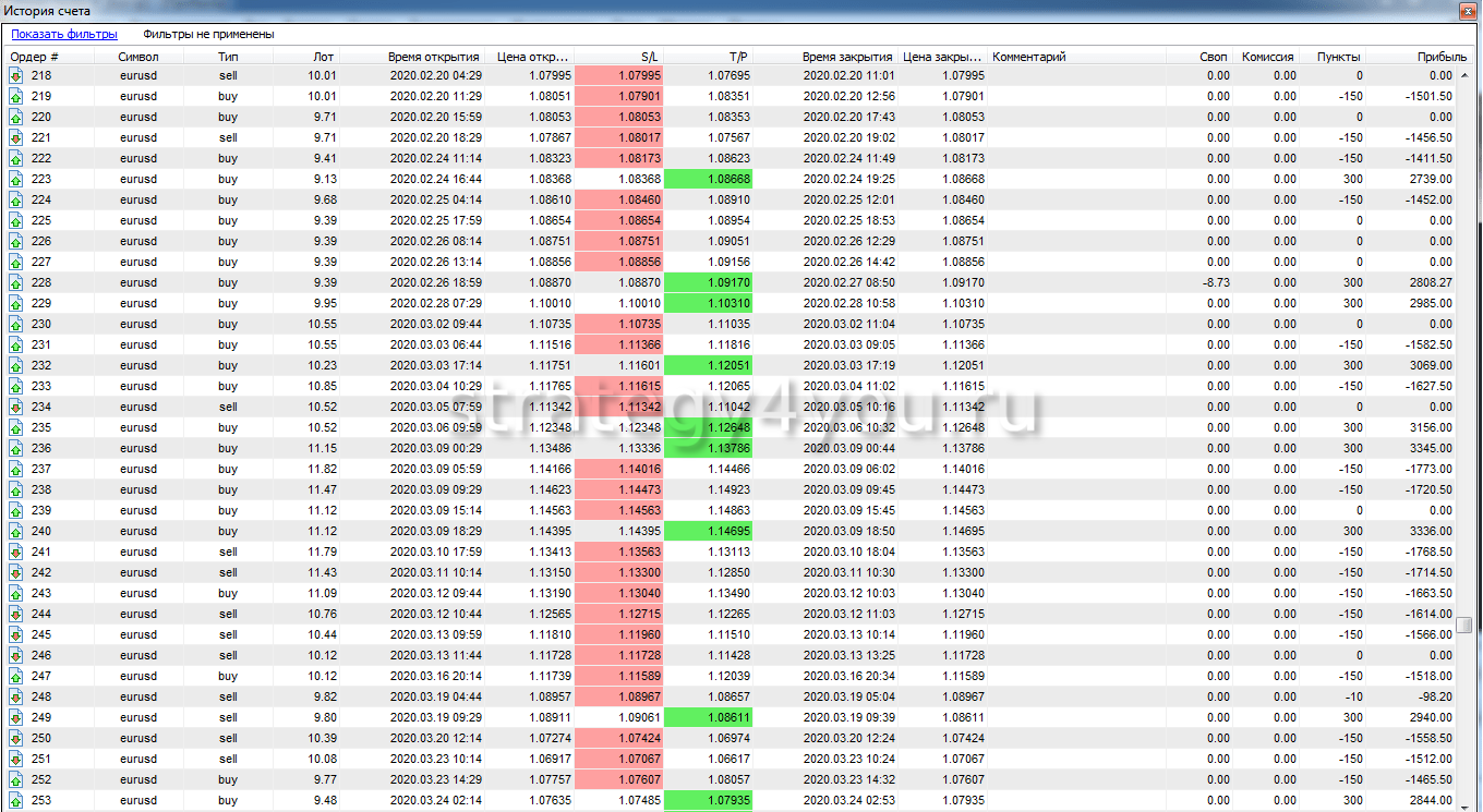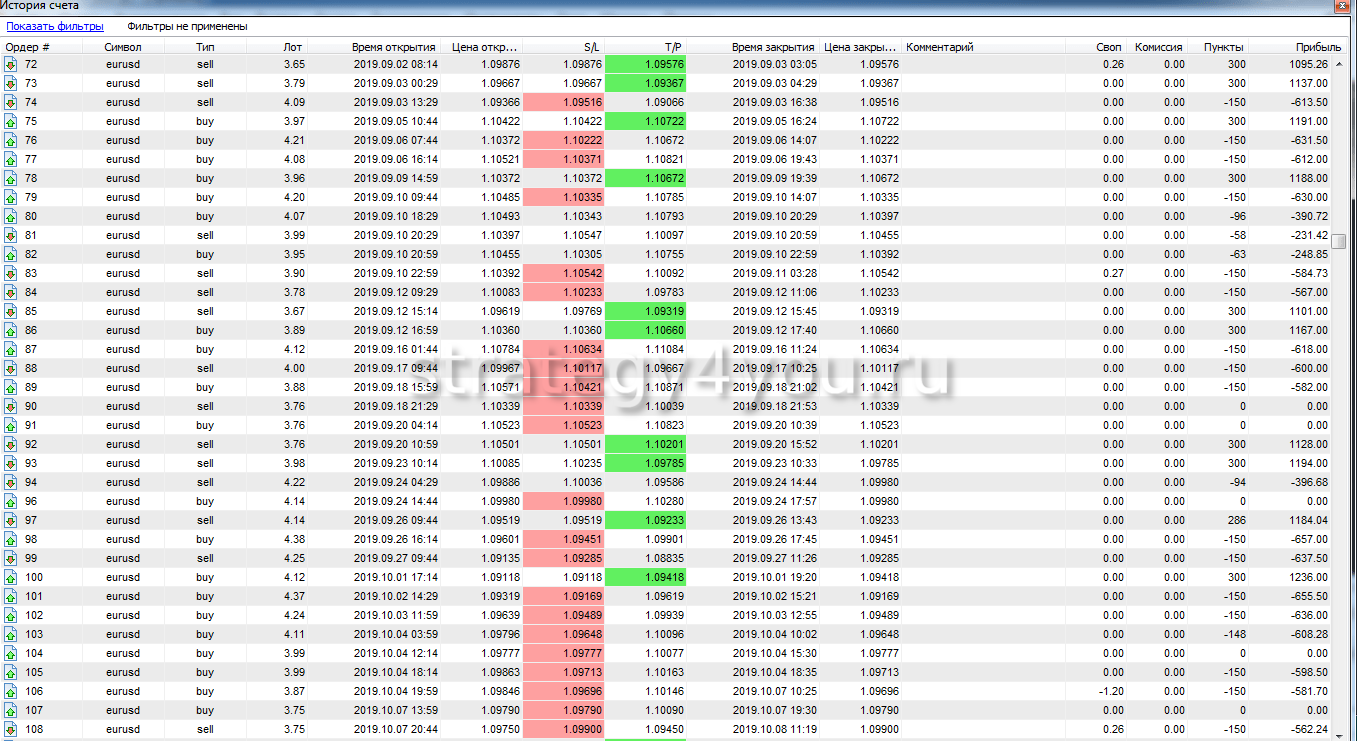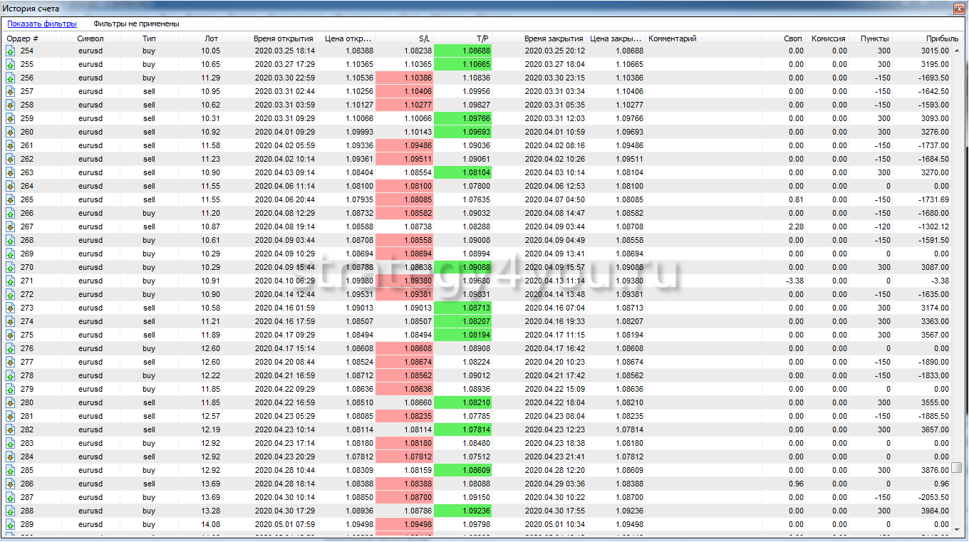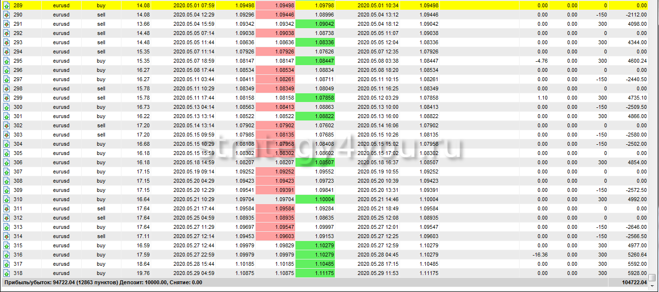 Так же публикуем для вас самый подробный отчет по всем сделкам за период тестирования торговой стратегии:
