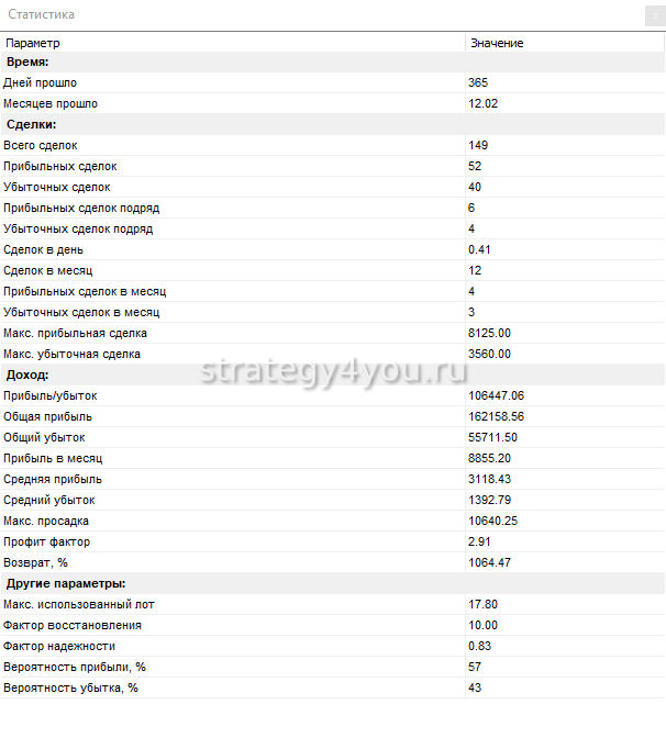 Всего было заключено сделок за 1 год на H1 интервале — 149. Прибыльных — всего 52. Убыточных — 40, остальные были закрыты в ноль — в точке входа в сделку.