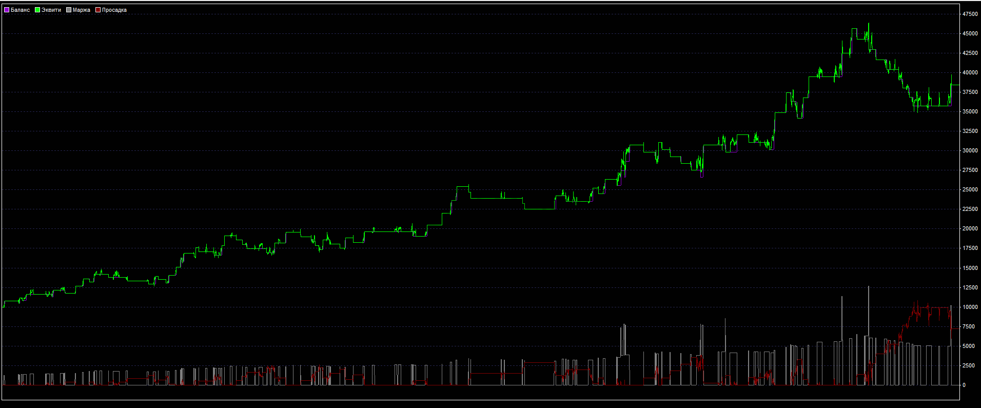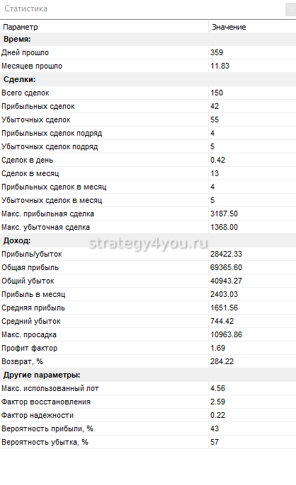Всего было открыто сделок за 1 год — 150. Из них прибыльных — всего 42. Убыточных — 55, а остальные — закрыты по безубытку.