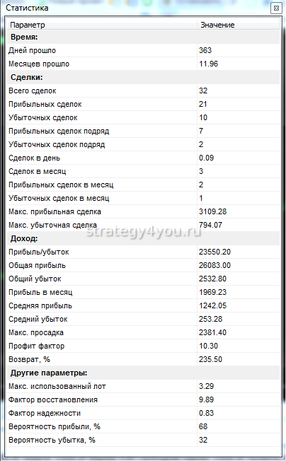 Заключение: прибыль за 12 мес составила +235,5% по одной паре — Фунт-доллар, вполне рабочая стратегия, но не стоит забывать что лот мы выбирали — динамический. С фиксированным прибыль будет меньше.