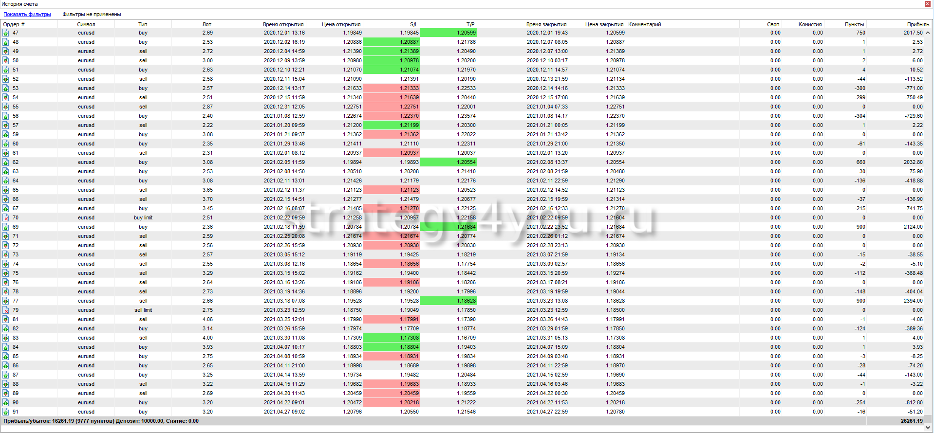 Всего было открыто за 1 год — 80 сделок. Из них прибыльных — всего 25. Убыточных — 34, а остальные — закрыты в ноль.