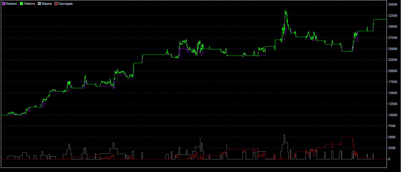 График однозначно не равномерный, но восходящий, просадки мы видим и иногда они бывают затяжные, но в общем за 1 год прибыль оказалась практически на максимуме депозита.
