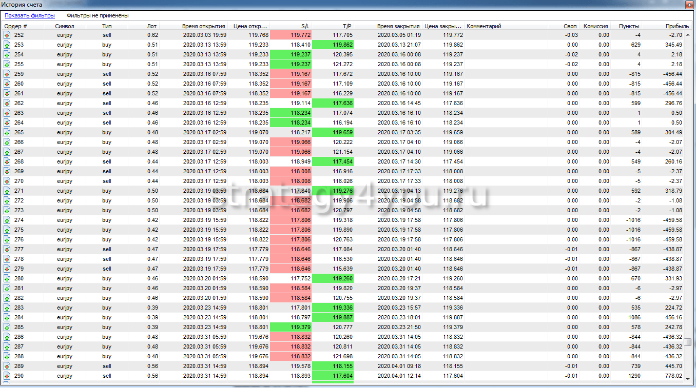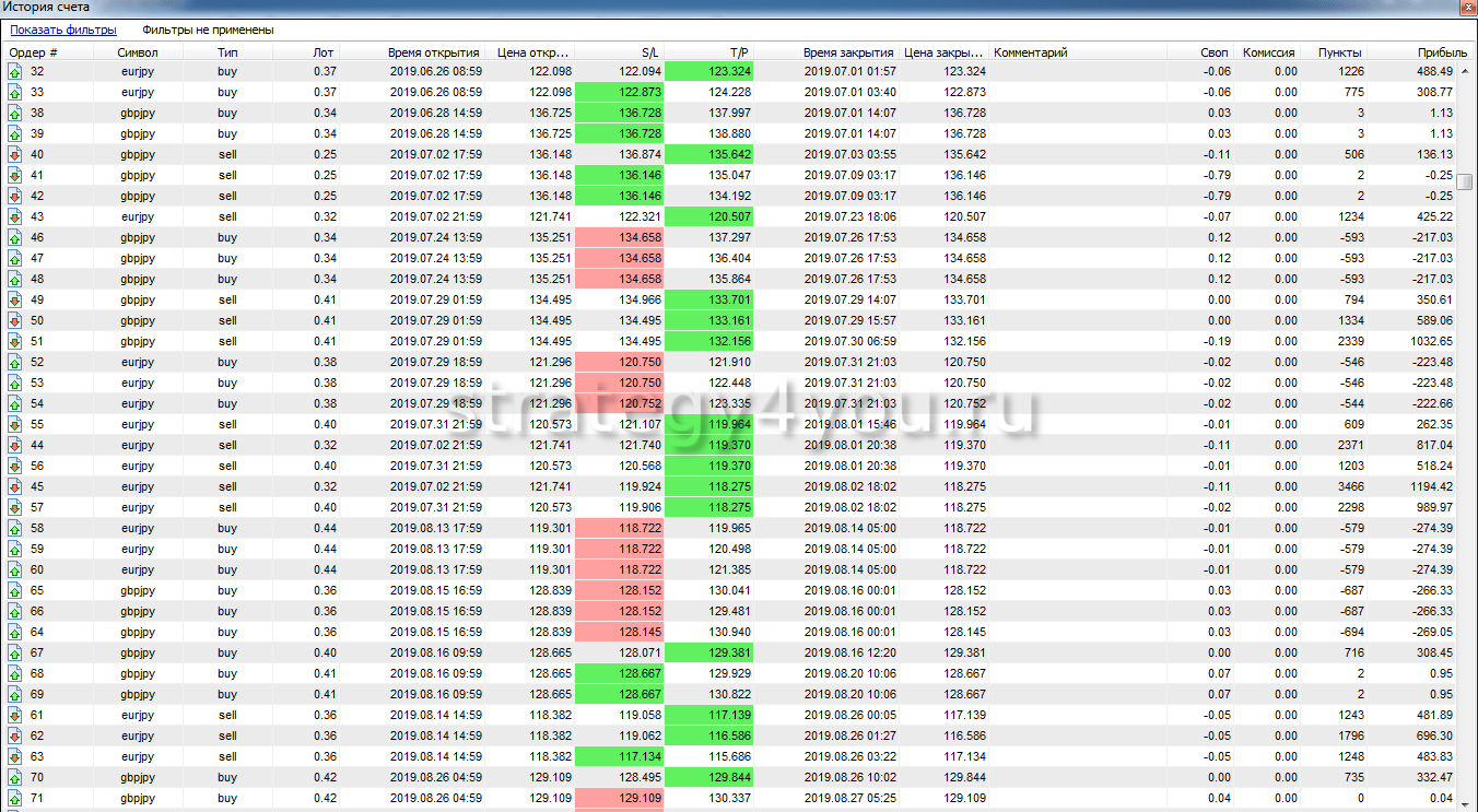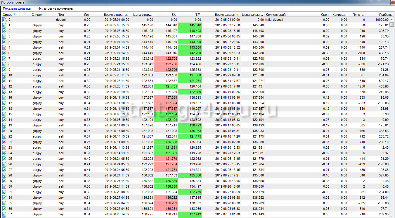 Так же публикуем для вас подробнейший отчет по всем сделкам за период тестирования стратегии: