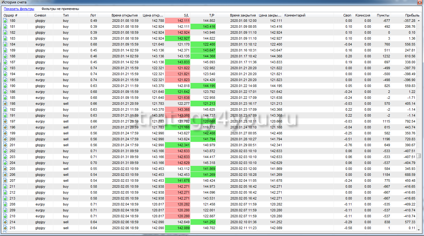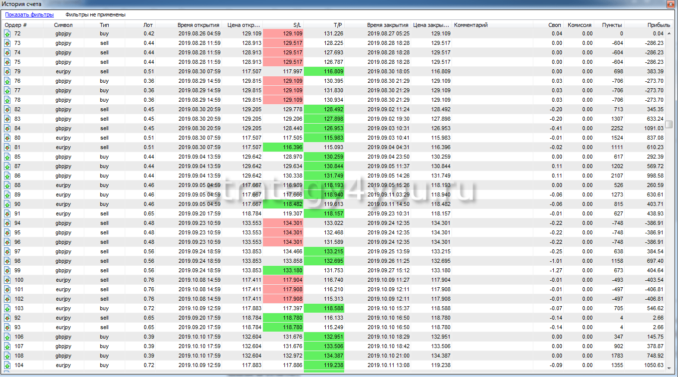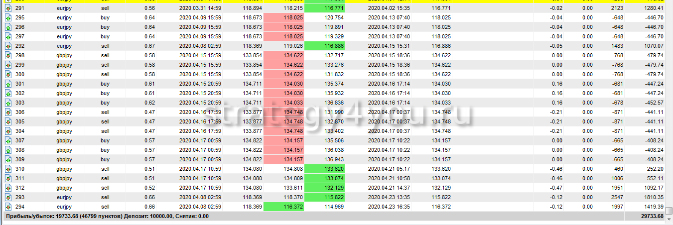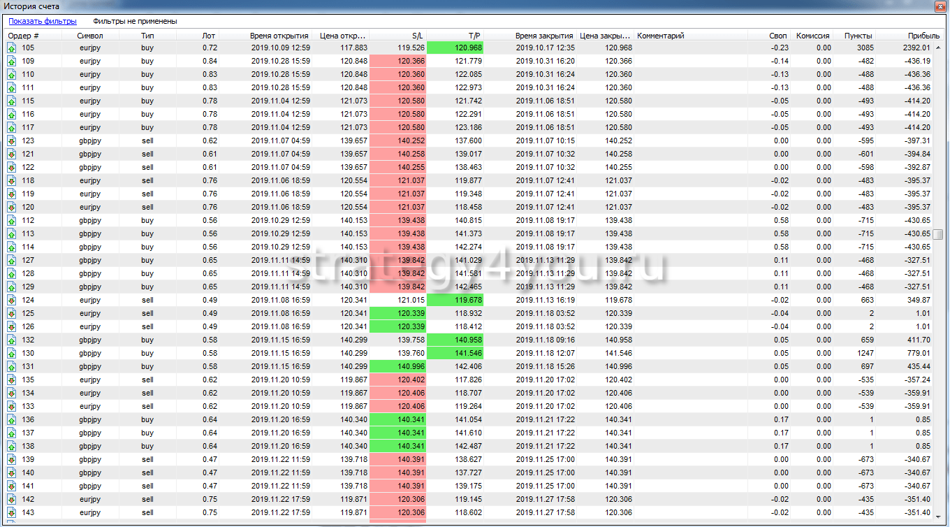 Так же публикуем для вас подробнейший отчет по всем сделкам за период тестирования стратегии: