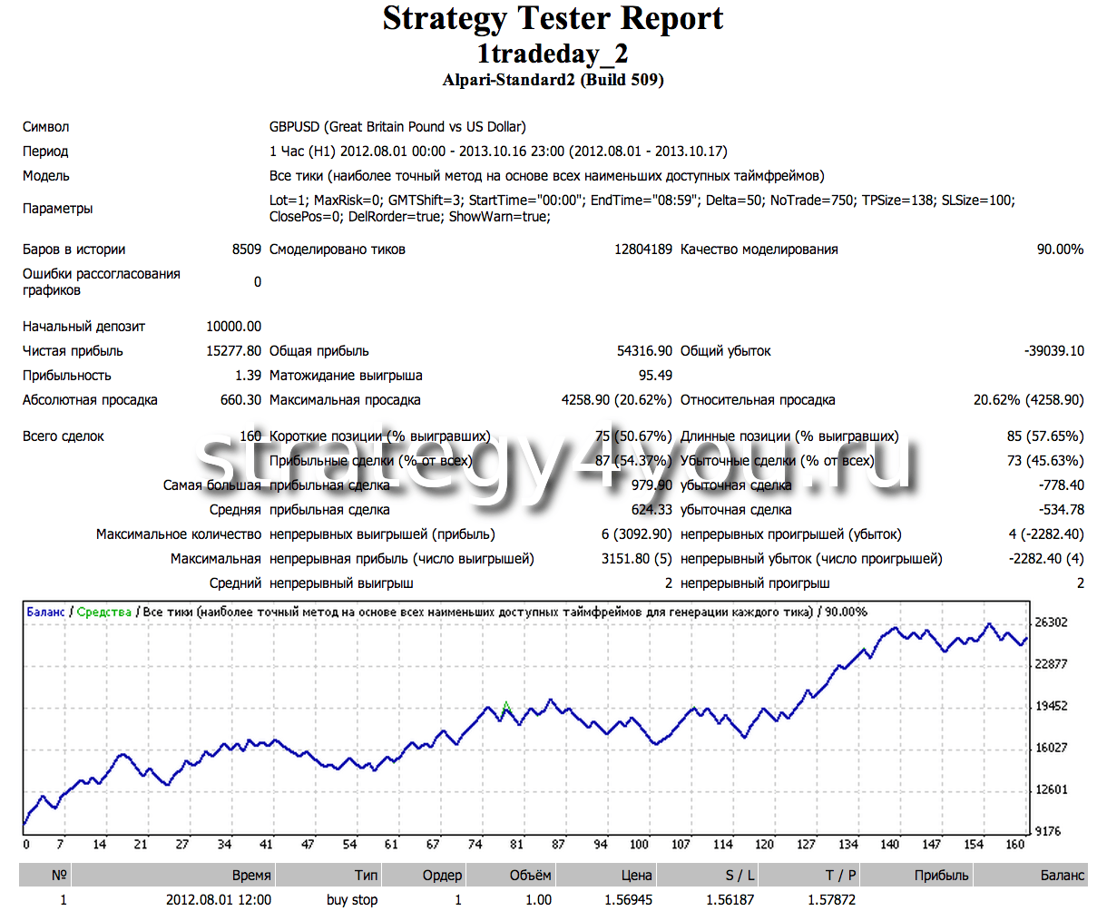 Тестирование проводилось при помощи Советника 1tradeday_2, и более-менее положительные тесты получились только на 2-х валютных парах: GBPUSD и GBPJPY, интервал — H1.