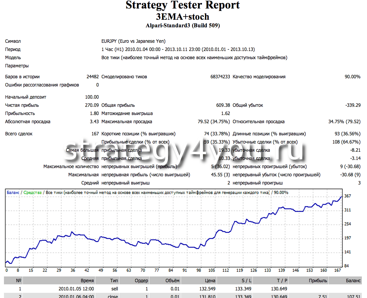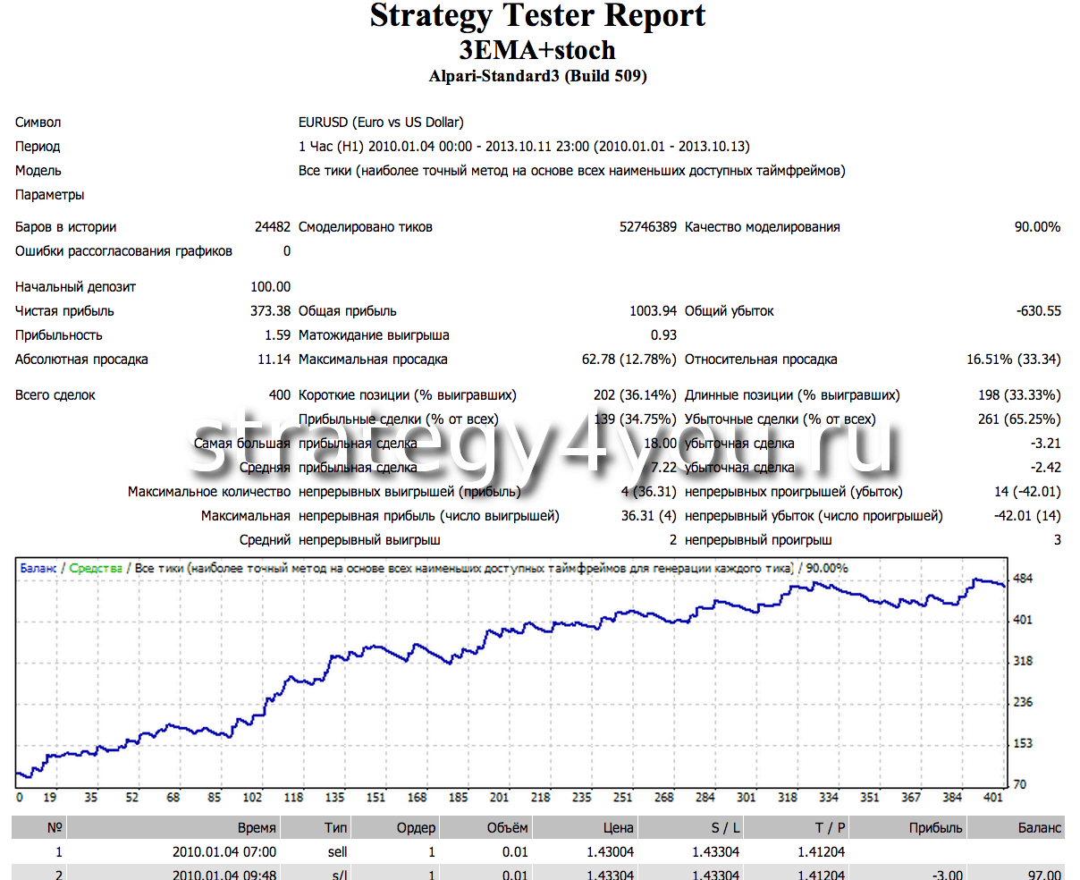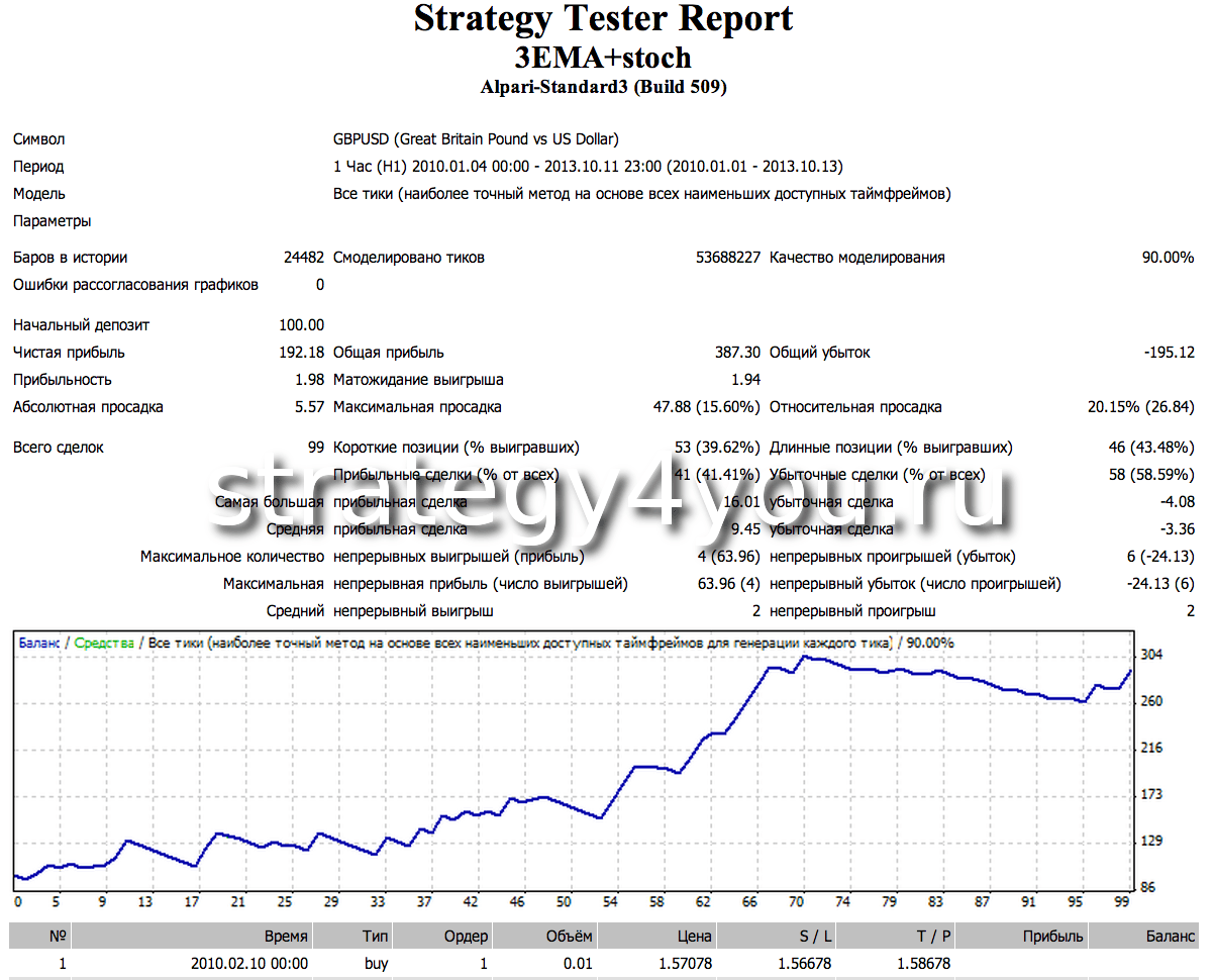 Долго описывать ситуацию не буду, потому вот несколько тестов стратегии форекс EMA (4+13+50) + Stochastic при помощи советника (который вы можете скачать в открытом коде в конце этой статьи с подробными отчетами, настройками и описанием параметров).
