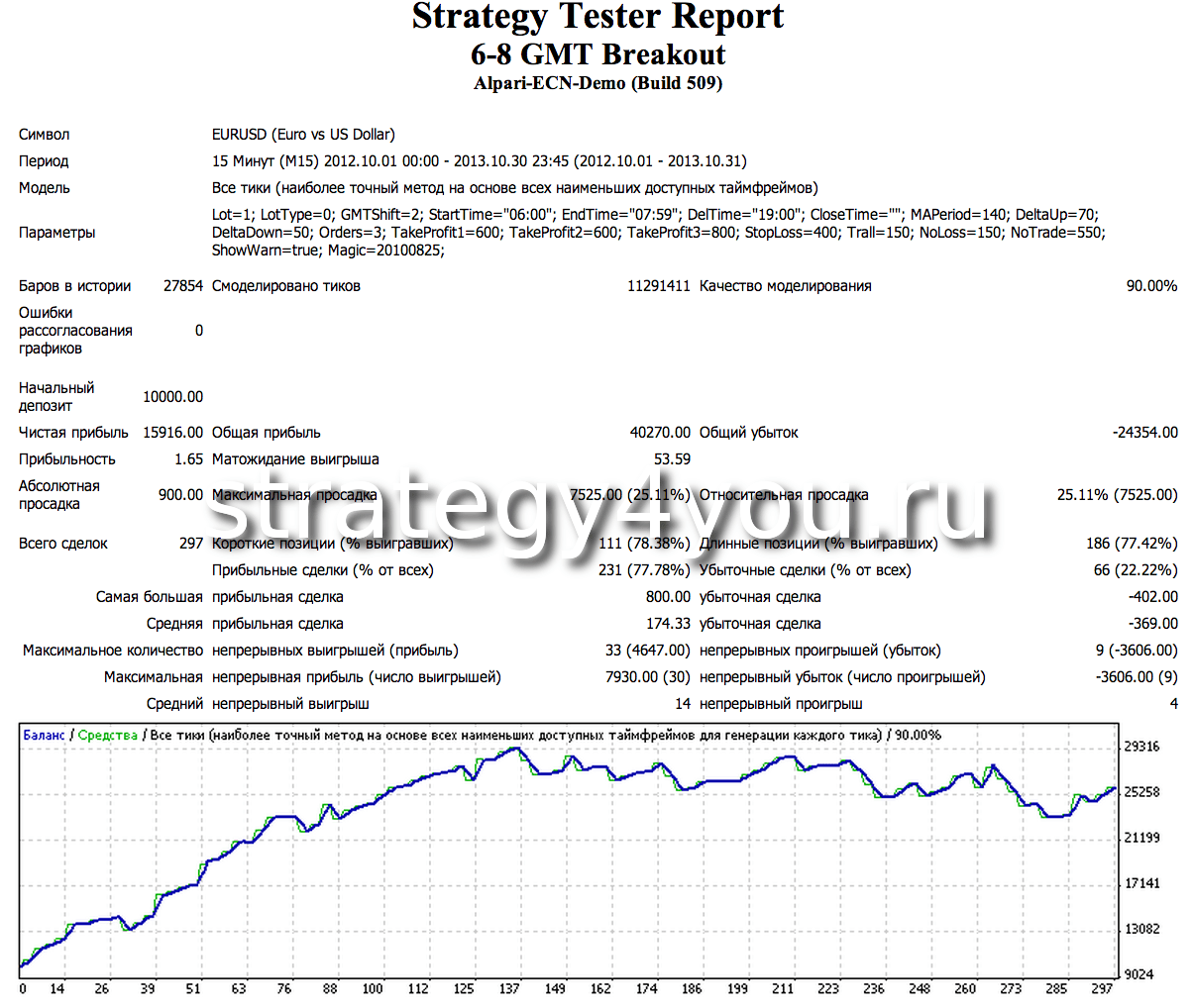 Отчет о работе советника 6-8 GMT Breakout на интервале M15 за период (2012.10.01 — 2013.10.31):