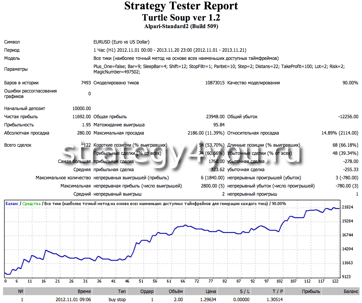 Сегодня мы рассмотрим тест стратегии форекс Turtle Soup / Turtle Soup plus One, который осуществлен при помощи одноименного советника форекс для торгового терминала MetaTrader 4 на валютной паре EURUSD (H1 и H4)