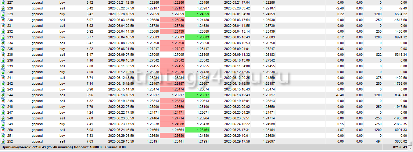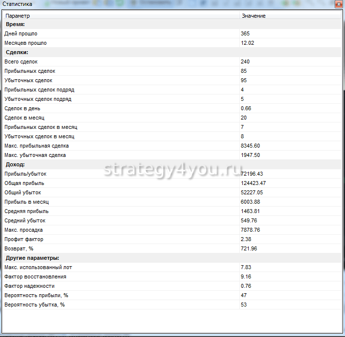 В нем отображены все параметры теста по валютной паре Фунт-доллар: кол-во совершенных сделок, общая прибыль и общий убыток, а так же кол-во убыточных и прибыльных сделок подряд и другая полезная информация.