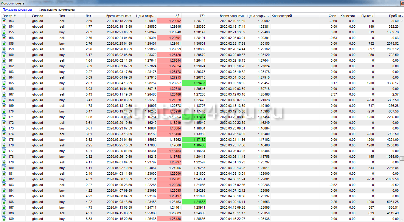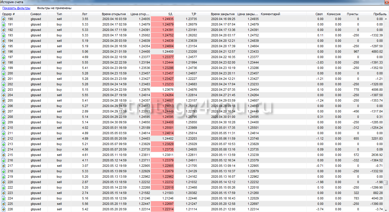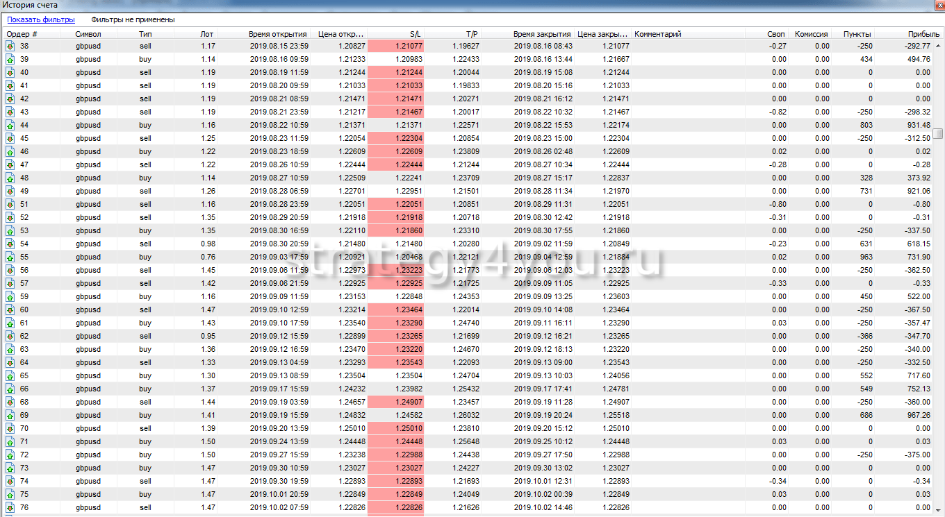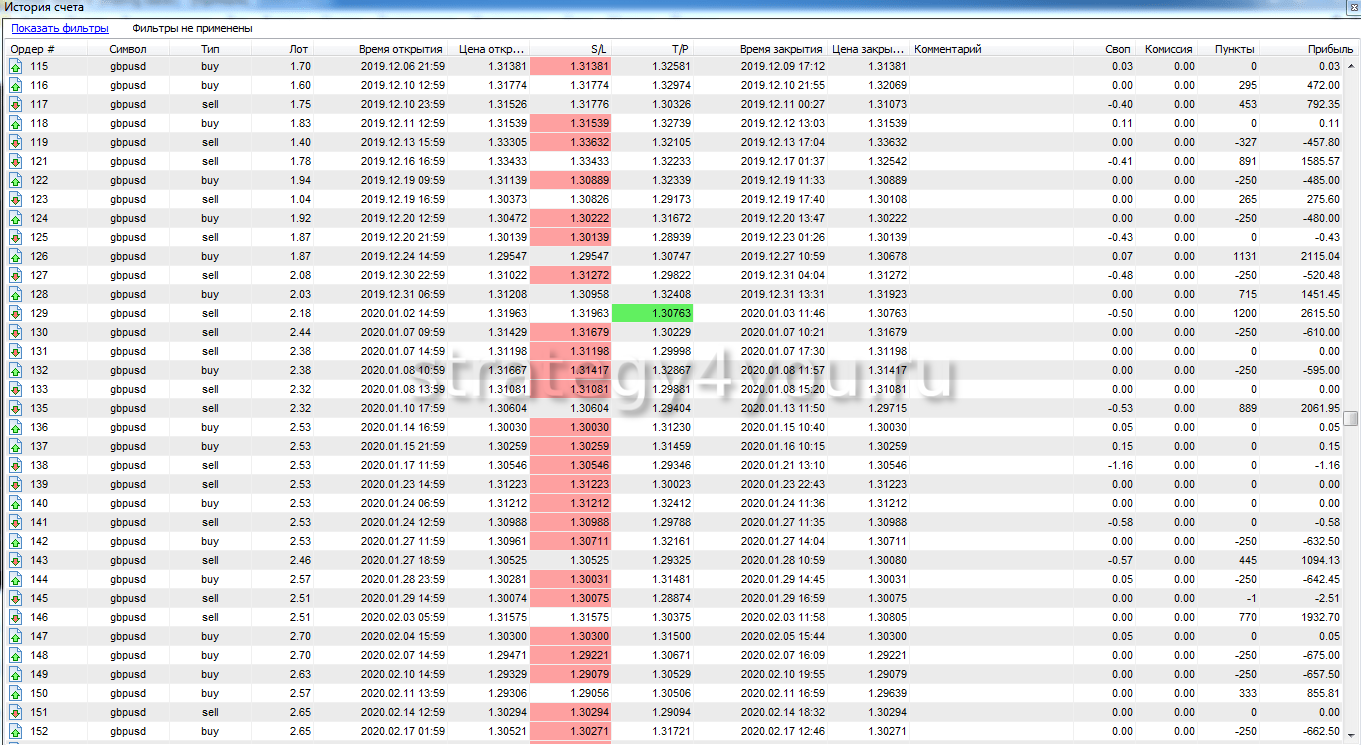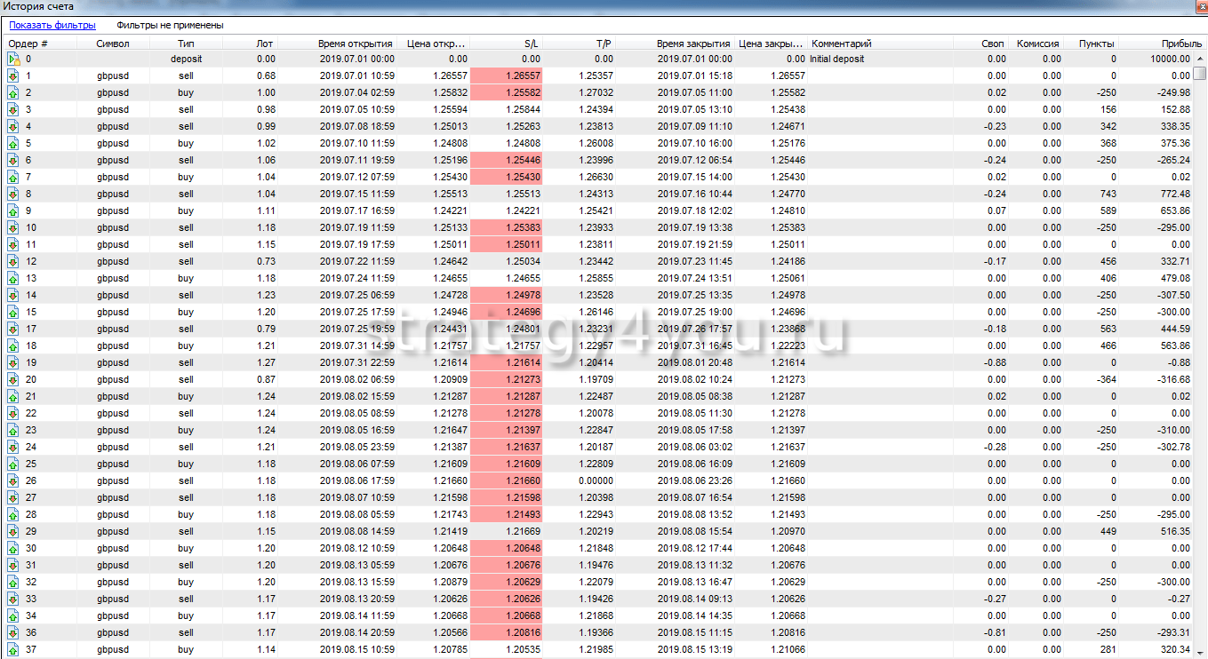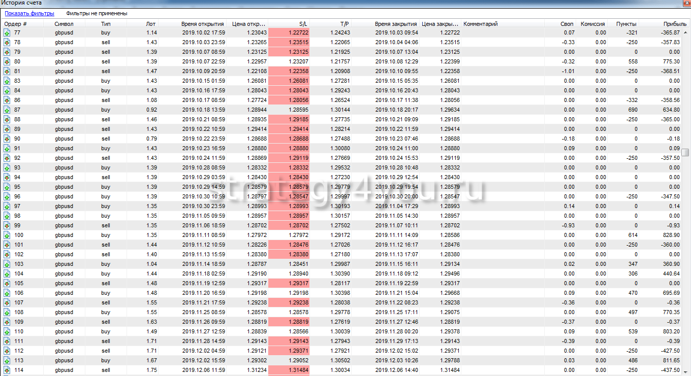 Так же ниже публикуем самый подробный отчет по всем сделкам за период тестирования торговой стратегии: