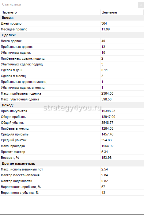 Всего было открыто сделок за 1 год — 40. Из них прибыльных — 13. Убыточных — 10, а остальные — закрыты в ноль.