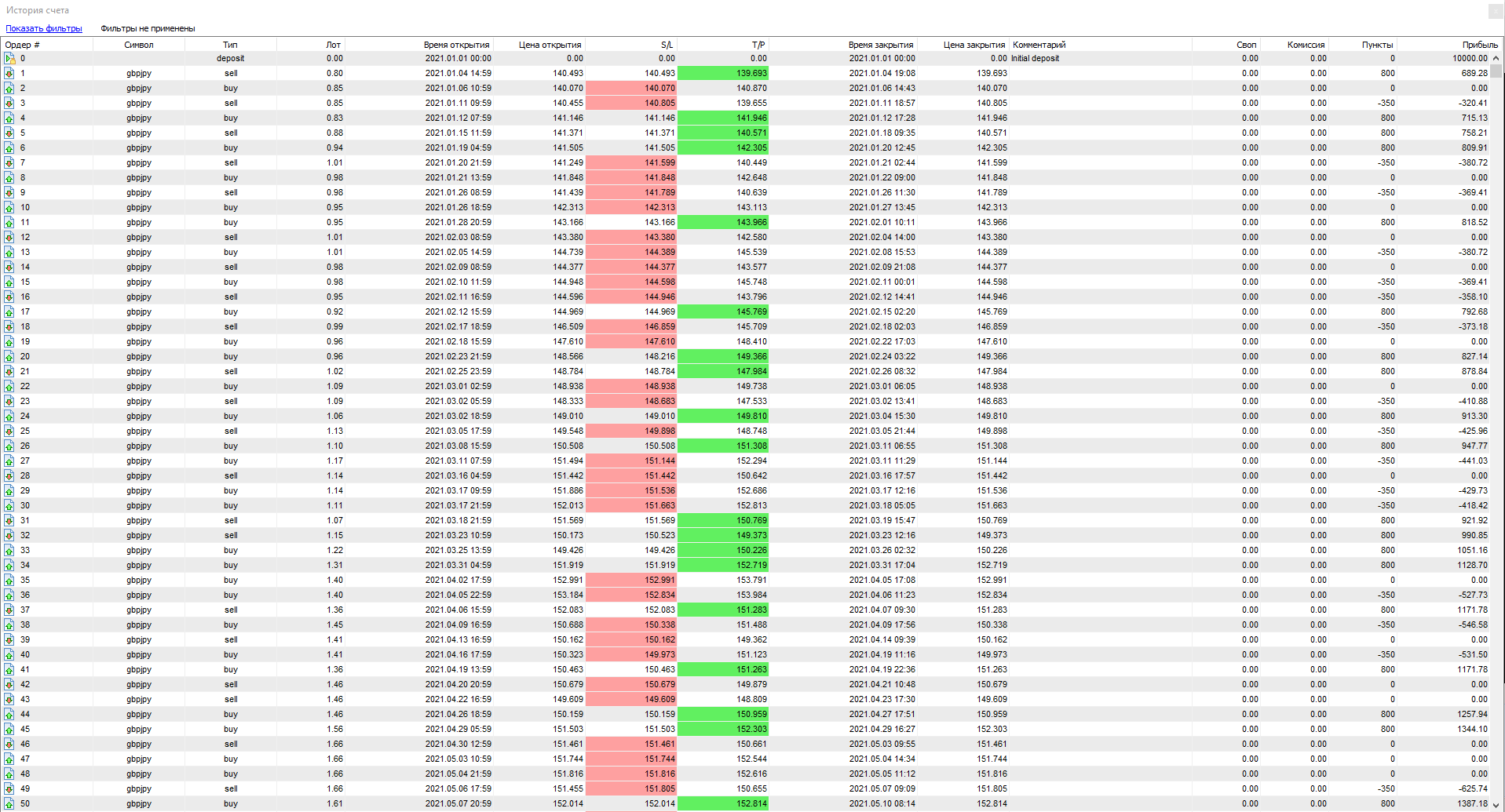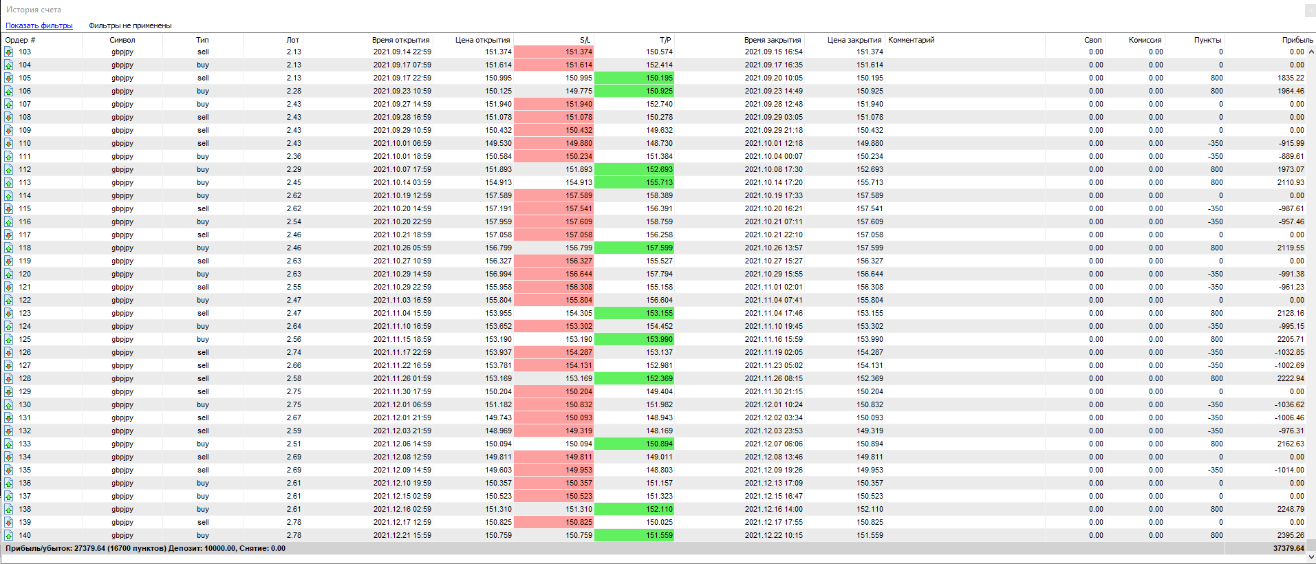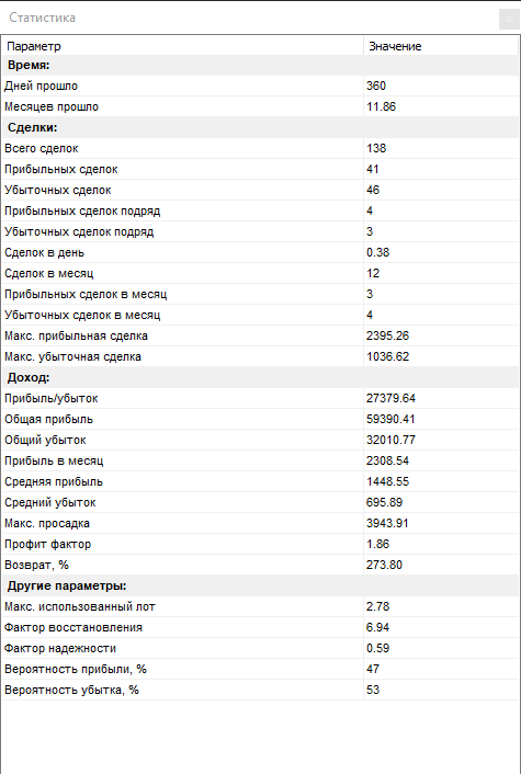 Всего за 1 год тестирования было открыто сделок — 138. Из них закрыто с прибылью — всего 41. Убыточных — 46, остальные — закрыты в ноль.