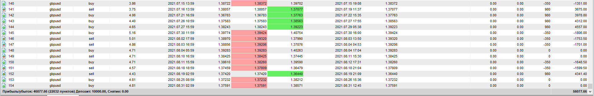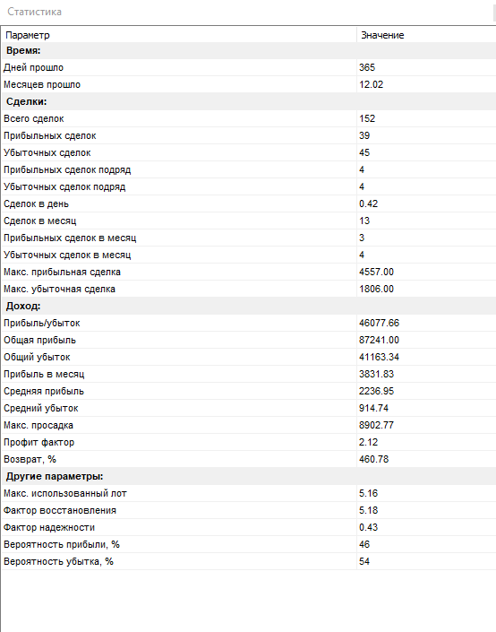 Всего было открыто сделок за 1 год тестирования — 152. Из них закрыто с прибылью — всего 39. Убыточных — 45, а остальные — закрыты по безубытку (в ноль).