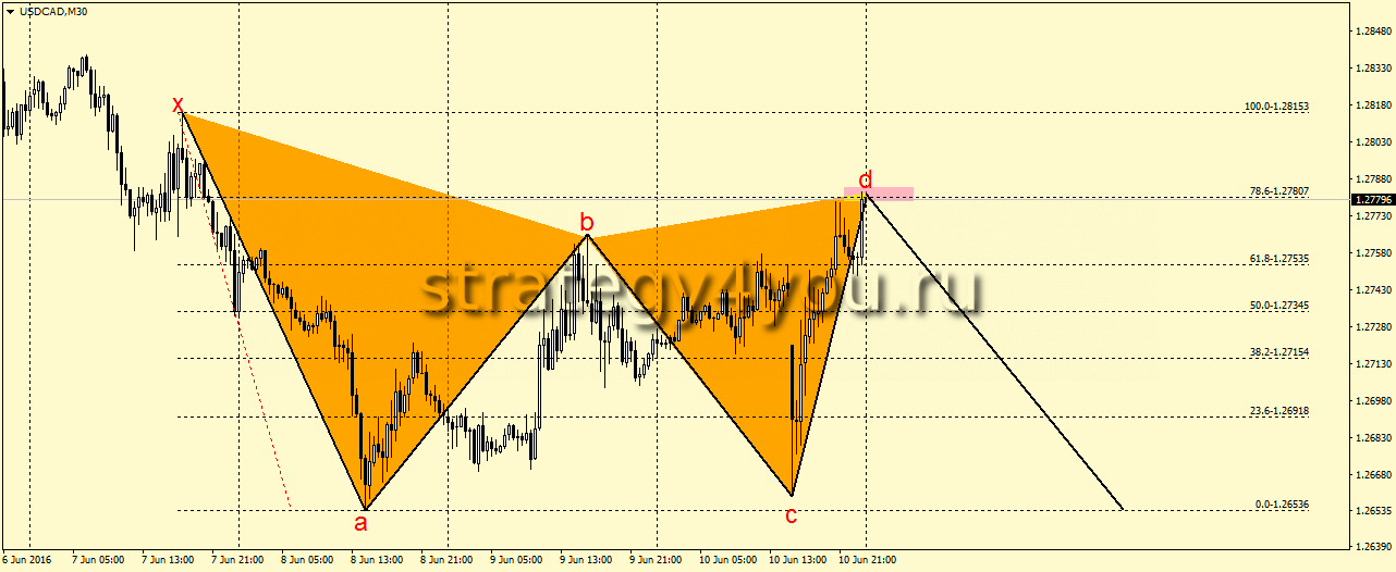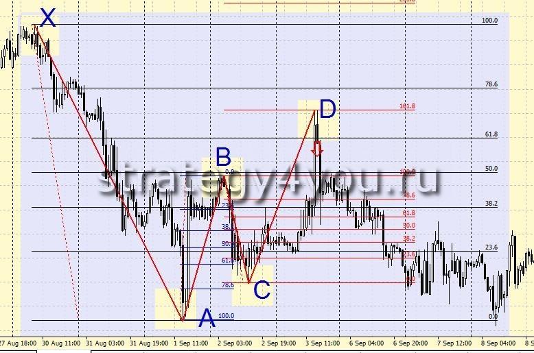 - линия CD доходит до 127%, 161,8% или кончается на 78,6% от XA.