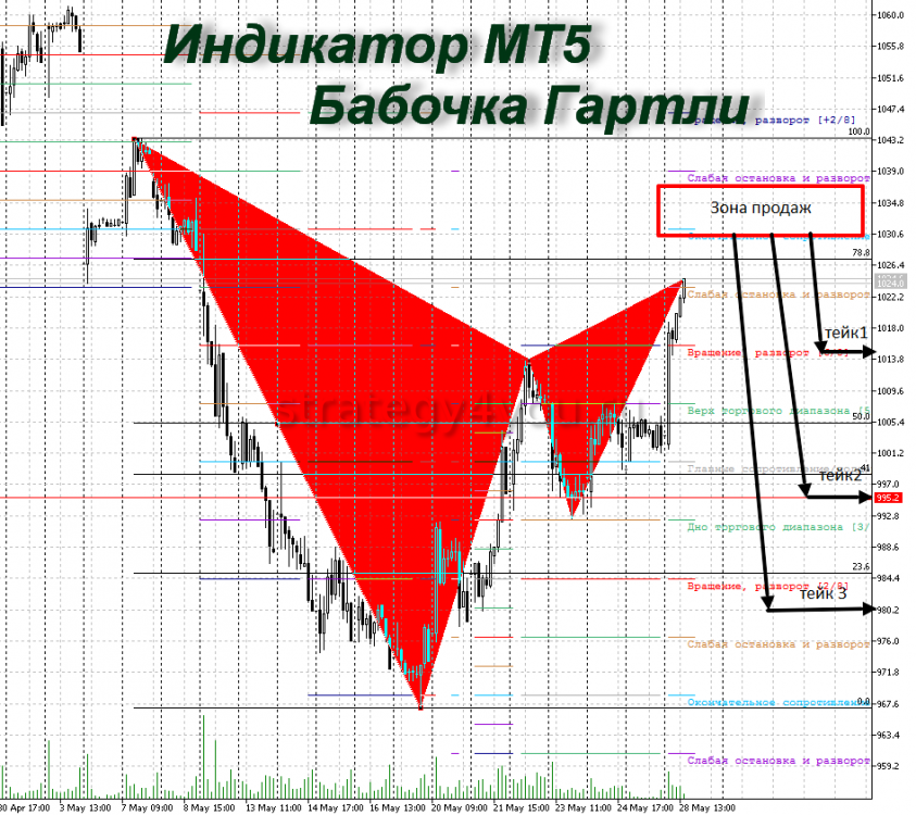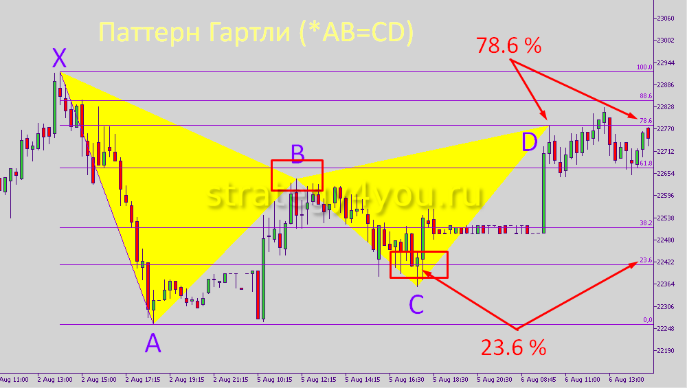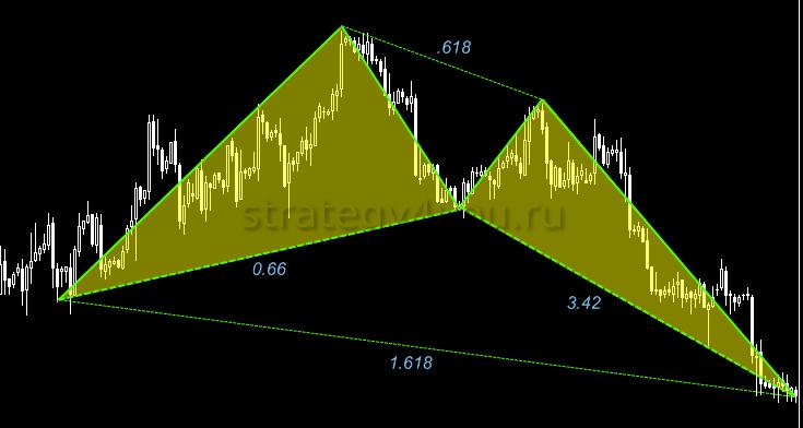 При гармоническом подходе паттерном Гартли должна возникнуть симметричная фигура с вершиной на уровне 1,62 от левого плеча и правым на 0,62 от головы, чтобы легко находить момент сворачивания фигуры и время входа в рынок.