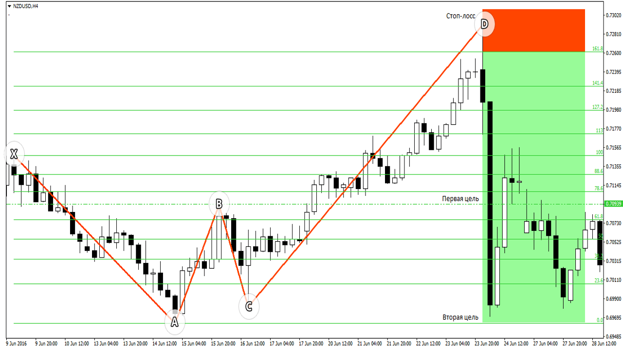 С виду они абсолютно одинаковые — у обоих при бычьем сетапе высшая точка А, низшая D, при медвежьем сетапе максимум точка D, минимум точка А.