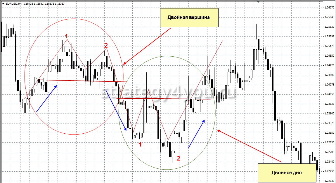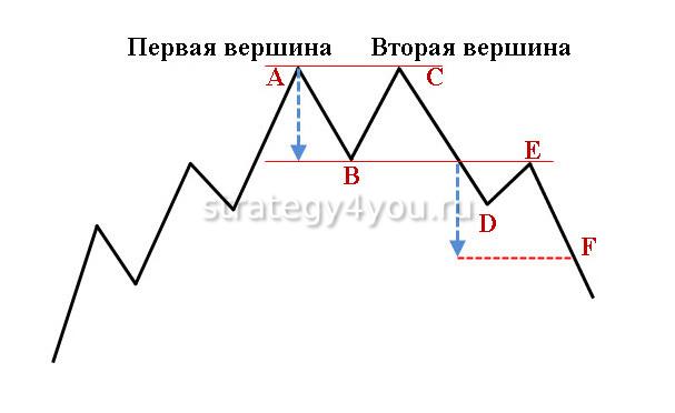 Текущие стратегии торговли на валютном или фондовом рынке способны принести хорошие результаты, если уметь правильно читать их и оценивать тенденции биржи на несколько шагов вперед. Фигура двойная вершина представляет собой некую степень развития ситуации на графике биржевых торгов. Она включает в себя 2 вершины и линию шеи, которая проходит через начальную точку формирования первого пика и спадания второго. После достижения первой вершины рынок совершает откат вниз.