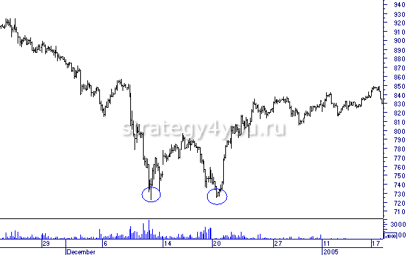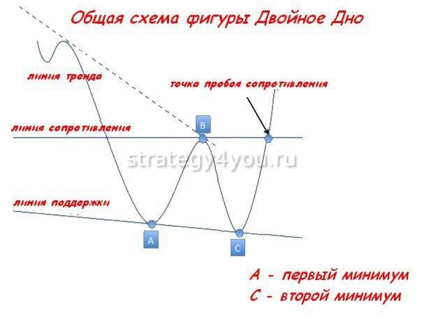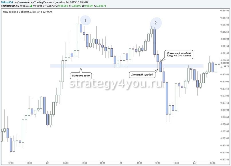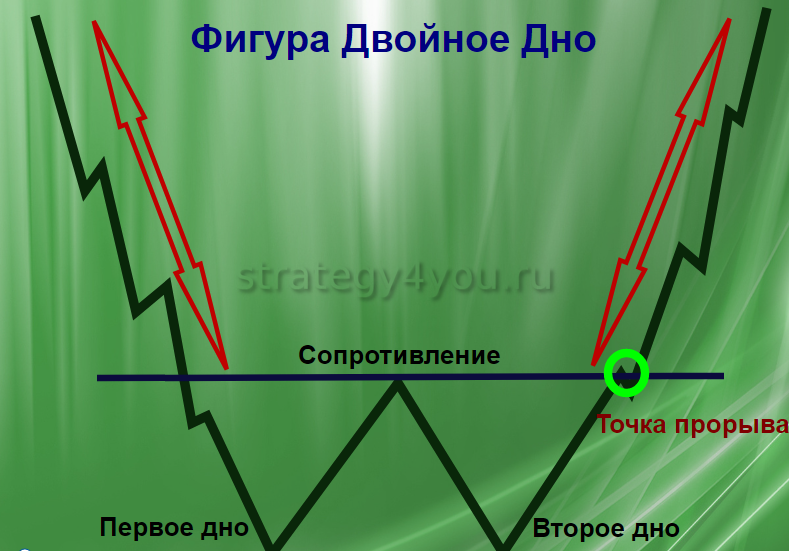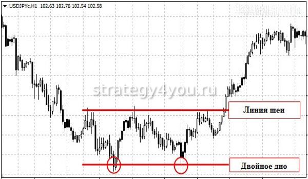 Работоспособность стратегии заключается в следующем. На первом этапе нужно определить нисходящую тенденцию биржевого рынка. Дождаться, когда цена позиции достигнет ближайшей области сопротивления. Формацию двойных пиков нужно искать в нижней части графика.