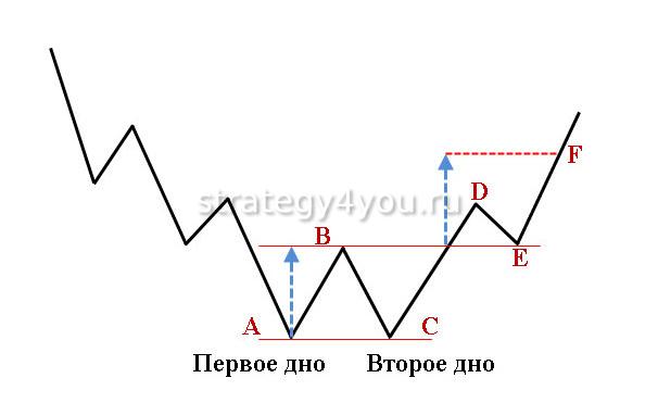 Удвоенное дно является разворотным графиком для медвежьего тренда и состоит из следующих частей: