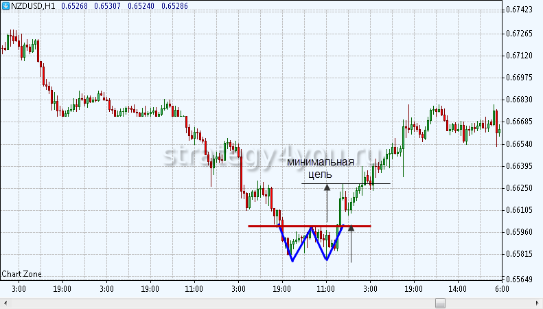 Правильное выставление стопов и профитов относительно фигуры двойного минимума обеспечит трейдеру беспроигрышную стратегию поведения при торгах. Стоп выдвигается за пределы той из вершин, у которой более трендовая цена. Для двойного основания эта цена будет наименьшей. Вторая ограничительная линия выставляется с отступом на несколько пунктов, для защиты от коррекции, которая сможет сформировать еще один виток.