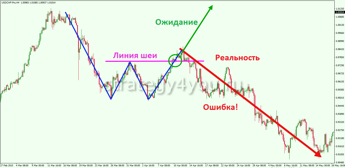 Самой распространенной и фатальной ошибкой при фигуре двойное дно, технический анализ которой показывает снижающий тренд, считается открытие ордеров на пробной шейной линии сразу после образования фигуры. При этом трейдеры часто не обращают должного внимания на содержание биржевого рынка.