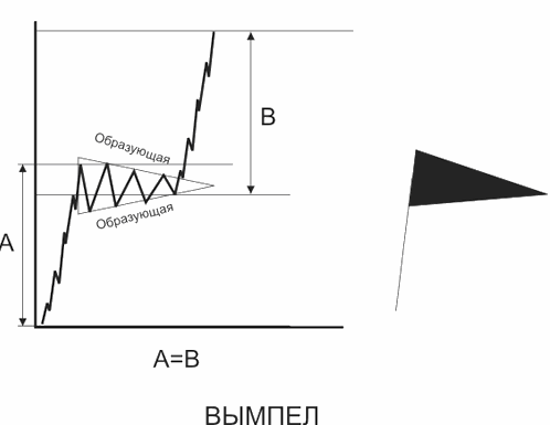 Фигура имеет форму треугольника, не всегда симметричного. Одна или максимум пара свечей, сформировавшаяся на импульсе, образует т.н. флагшток. Его наличие отличает Вымпел, фигуру продолжения тренда, от других сходных: Треугольника и Клина.
