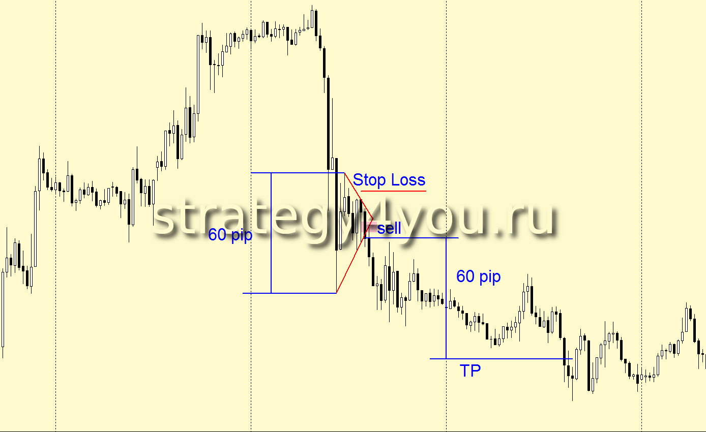 Стратегия для перевернутого, «медвежьего», паттерна полностью аналогична, только с учетом его зеркальности. Как только цена выходит за границы фигуры, открывают позиции, но не длинные, а короткие. Уровень Take Profit также измеряется по длине флагштока, а Stop Loss помещается на десяток пунктов выше ближайшего максимума.