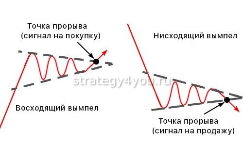 Торговать следует исключительно в том же направлении, в котором двигался рынок до образования Вымпела. Если пробой произошел в противоположную сторону, входить на рынок не рекомендуется. Такая динамика характерна для периода коррекции.