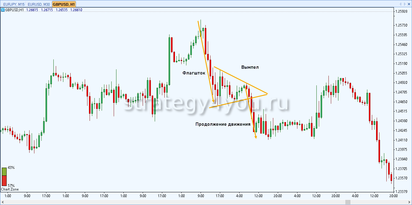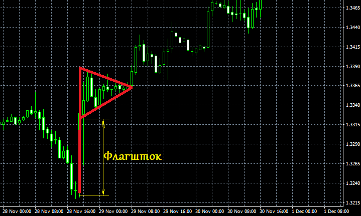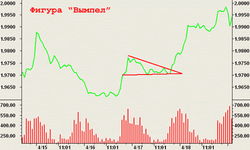 Когда формируется фигура Вымпел, Форекс демонстрирует временное затишье, а значит, тренд подтвержден и его движение продолжится. Подобная модель образуется после резкого скачкообразного возрастания цены.