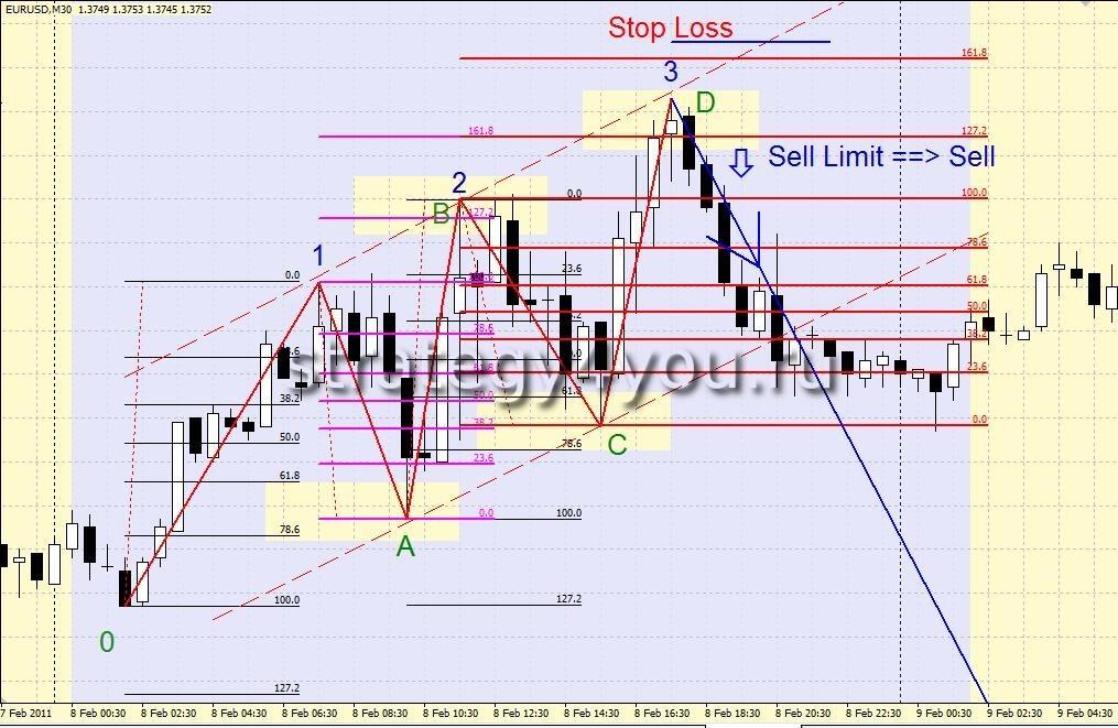 4) Если эти условия выполнены, то на расстоянии 1.27 или 1.618 (если точка B находится на расстоянии 1.27 х 1A — то расстояние = 1.27, если B находится на расстоянии 1.68 х 1A — то расстояние = 1.68) от отрезка «B-С» или «2-С» размещаем отложенный ордер Sell Limit, на рисунке он обозначен как точка 3 или D !
