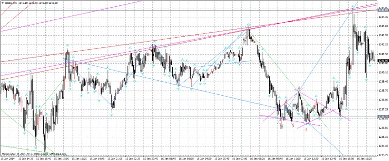 можно ли считать бриллиантом то, что сегодня нарисовалось на золоте ( таймфрейм М5), т.е. 16.01.2014 между свечами 9.45 и 16.00 (цвета Margеrita)? Точка high cамой высокой бычьей свечи достигла линии цели ЕРА(синяя), проведенной через точки 1,4 волны Вульфа ( волна Вульфа, правда, неправильная: линии 2,4 и 1,3,5 пересекаются cлева, а не справа, но у Л. Рашке, кстати, тоже есть подобные примеры — рисунки 15.5; 15.6; 15.7).