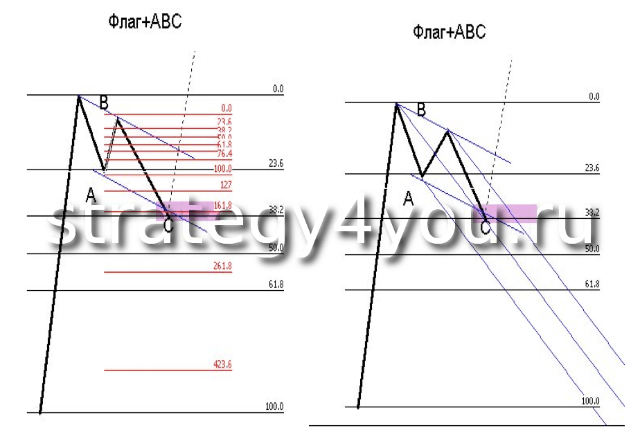2) В идеале точка «С» располагается на пересечении коррекционного канала и уровня фибоначчи от флагштока, следующего за уровнем на котором образовалась точка «А». Дополнительным подтверждением может послужить расширение фибоначчи растянутое от «А» к «В», чаще всего это уровень 161,8 «А-В» (рис 4).