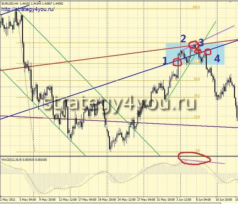 Точка 2: Если вы не вошли в точке 1 на продажу, входим на ретесте красной линии тренда + замечаем, что образовалась дивергенция MACD, стоп-лосс тот же.
