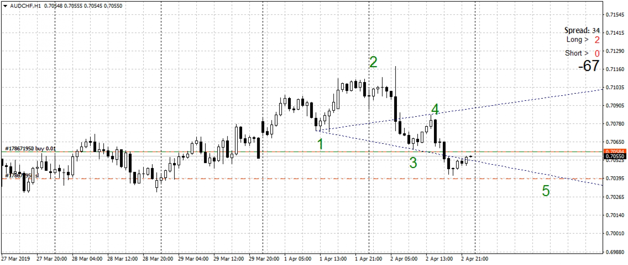 Вот только просто входить на пробой не охота, учитывая что может быть и ложный пробой, поэтому перейдя на часовик я вижу Волну Вульфа на покупку, покупаю, стоп по Вульфу на часовике, а тейк по клину на четырехчасовике, получается 1 к 10, можно и рискнуть, проверить торовую идею.