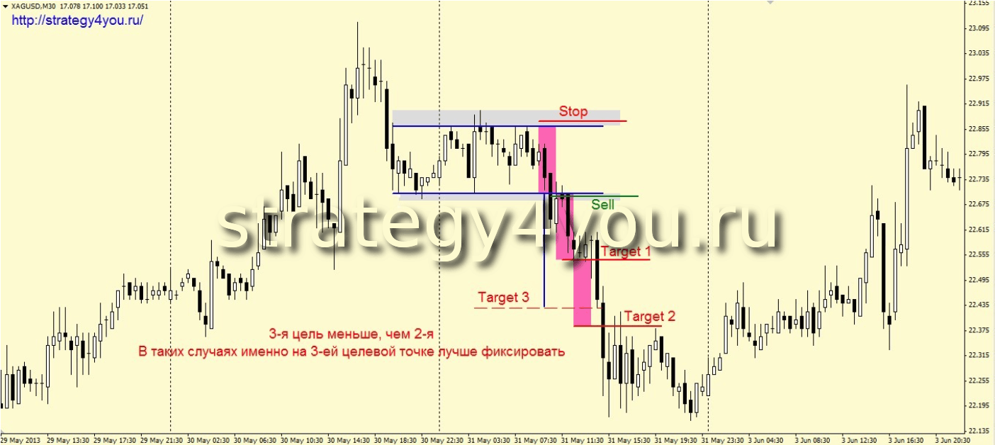 Основная и первая цель это расстояние, между внутренними линиями отложенное от точки входа. Вторая цель – два этих же расстояния. Третья цель получается следующим образом, проводится горизонтальная линия от первой точки прямоугольника (начало) до точки пробоя, а затем эта линия переворачивается на 90 градусов от точки входа, то есть, ставится вертикально.