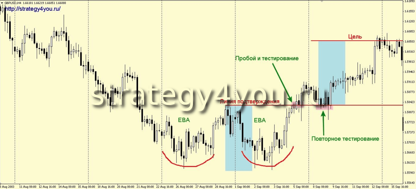По сравнению с предыдущей вариацией, эта модель идет в обратном порядке. То есть, сначала формируется минимум/максимум по типу «Ева» (плавное дугообразное движение).