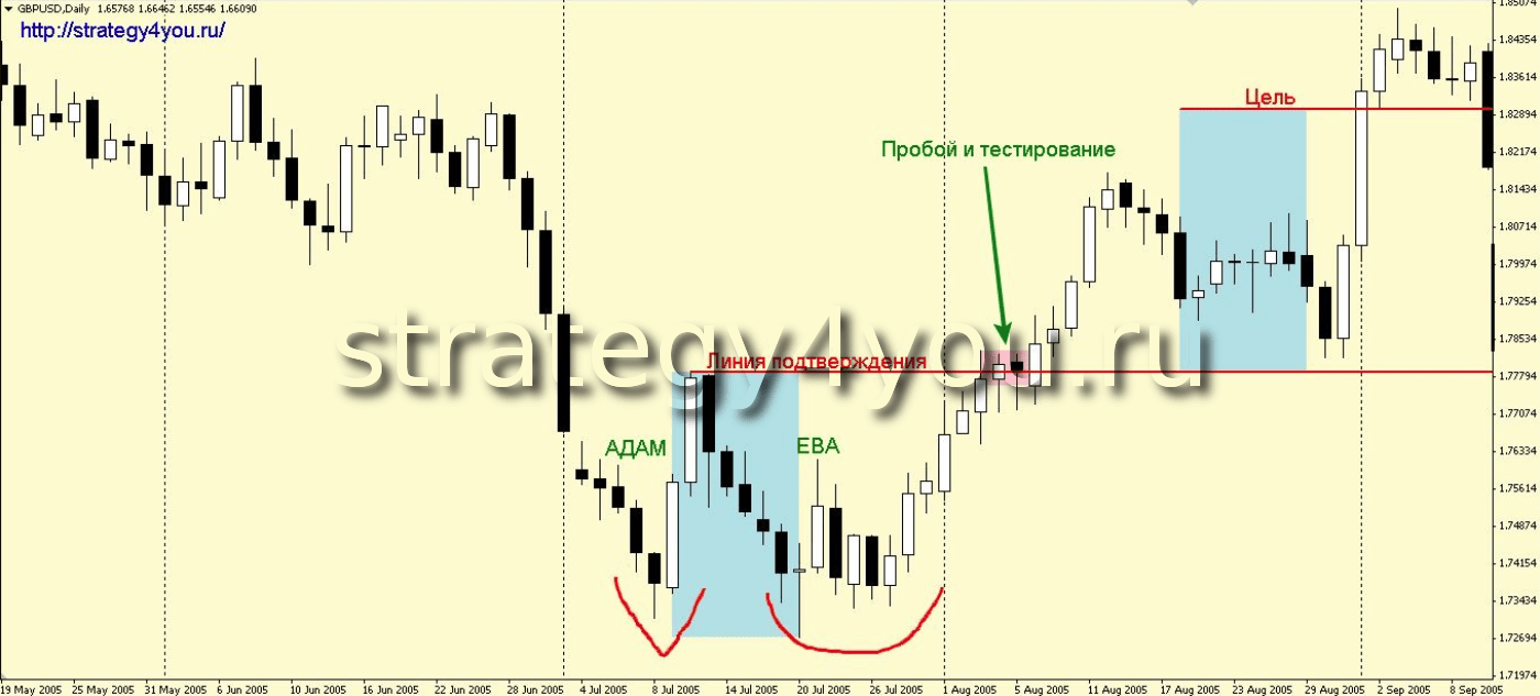 Из самого названия становится понятно, что первый (левый) минимум/максимум формируется резко и импульсивно (Адам), а второй экстремум (правый) развивается по дуге и плавно (Ева).