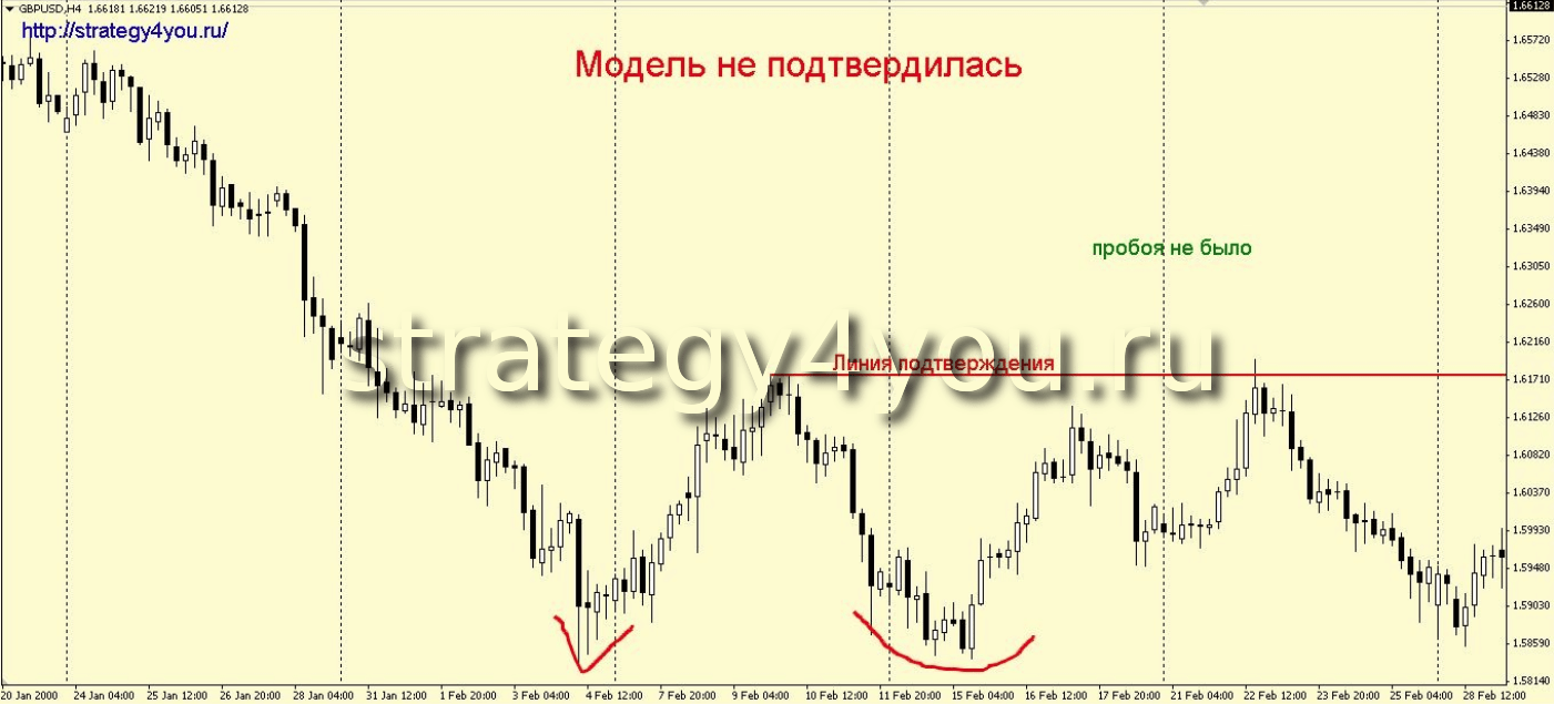 При формировании этого паттерна, обязательно дождитесь пробоя линии подтверждения: