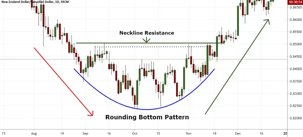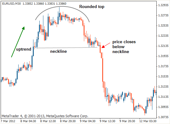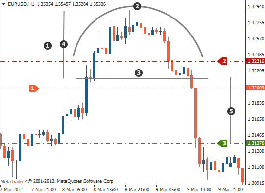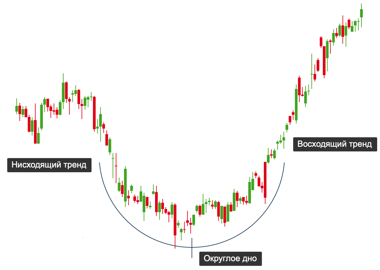 1) На нисходящем тренде, формируется закругленный минимум, подобный тому как вы видите на рисунке.