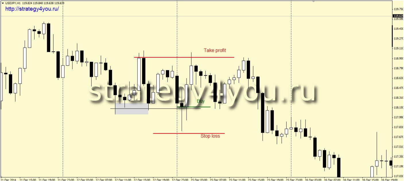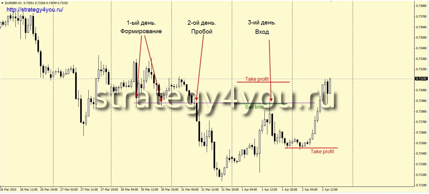 3) Тейк-профит распологается на предыдущем минимуме (после формирования уровня) или на минимуме вчерашнего дня, в зависимости, что из них находится дальше. То есть выбираем более отдаленный уровень из этих двух описанных.
