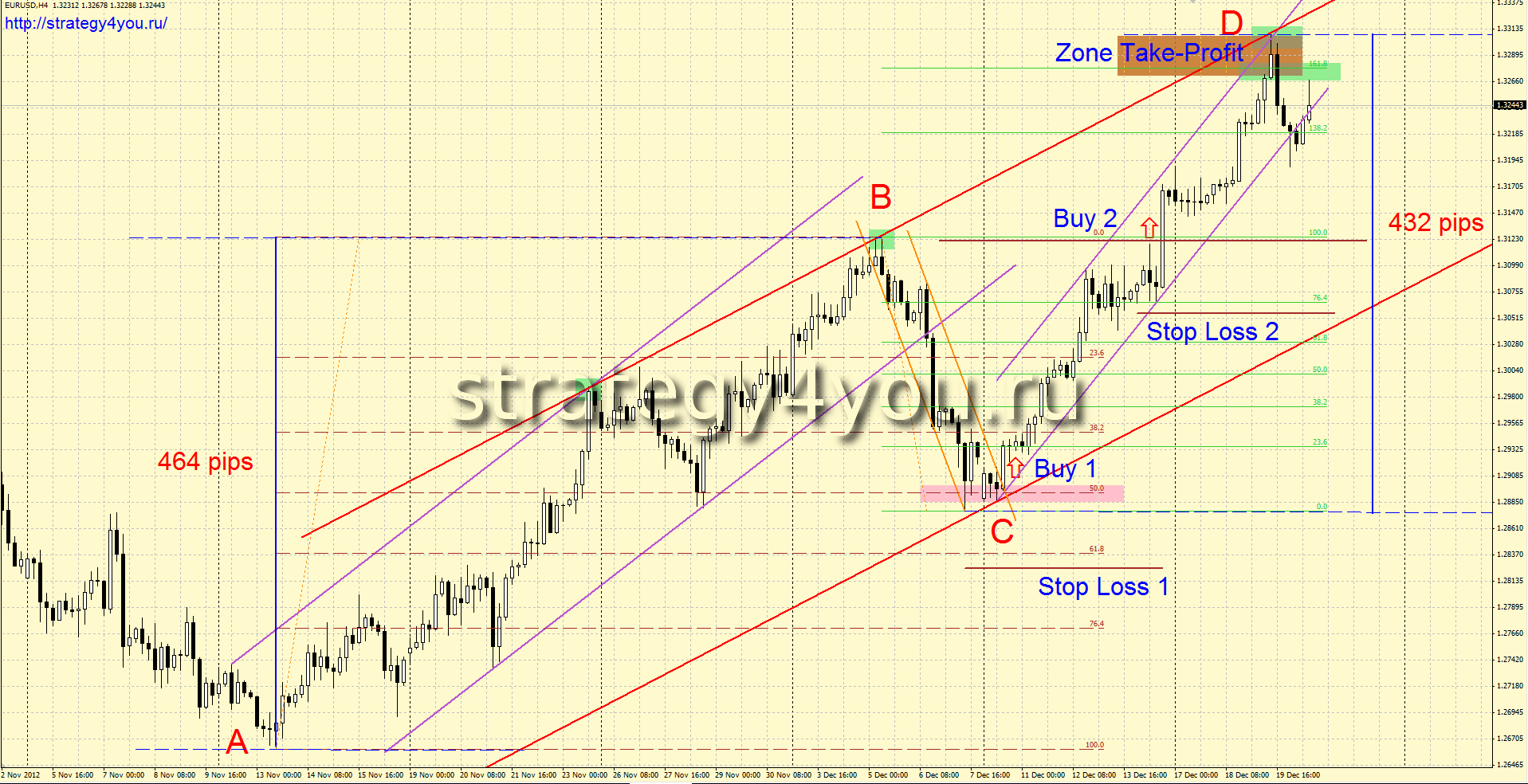 На рисунке Zone Take Profit: верхняя красная линия тренда красного цвета (3-е касание) + верхняя линия канала фиолетового цвета волны CD + расширение 161,8% по Фибоначчи волны ВС
