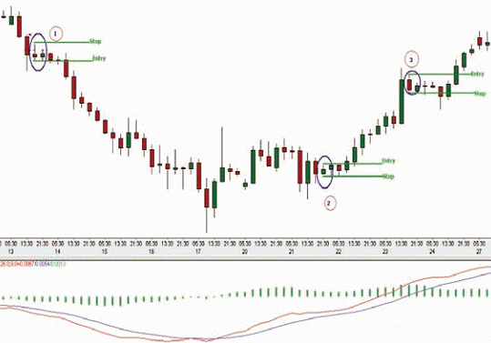 На пробой вложенной свечи. Если на восходящем тренде формируется Ib, открывают отложенный ордер на покупку на уровне максимального значения внутренней свечи. При этом стоп-лосс можно установить на минимуме ВБ или материнской свечи. Тейк профит должен быть в 2 раза больше стоп-лосса. На нисходящем тренде заключают аналогичную сделку на продажу.