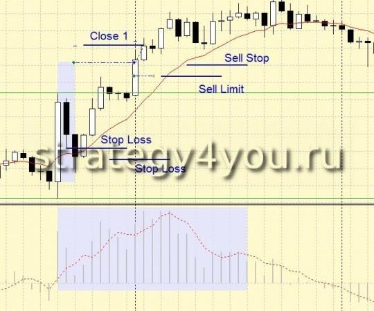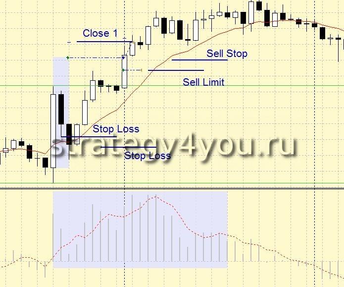 После небольшого движения цены по тренду происходит небольшой откат. Когда цена достигнет указанного уровня закрытия бара, открывают сделку.