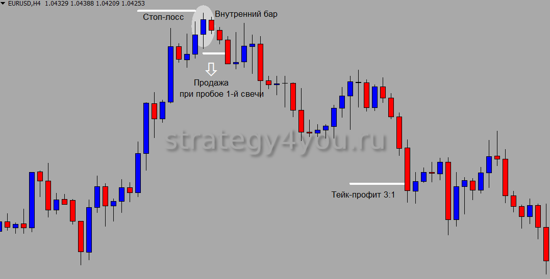 Когда появляется Внутренний бар, опытные игроки часто применяют стратегию разворота цены, однако новичкам в прайс-экшн делать этого не стоит. Объяснить это можно тем, что такие модели нередко дают ложный сигнал на разворот. После небольшого отката цена продолжает движение по тренду.