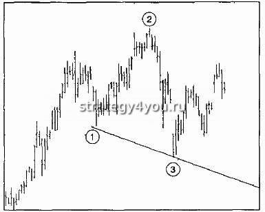 Обычно, мы находим точку 2 лишь после того, как сформируются точки «1» и «3». «Точка 2» необязательно должна быть долгосрочным разворотом тренда. Главное, чтобы она была максимумом или минимумом крупного колебания на рынке.