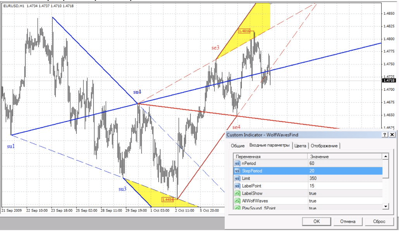 Нужно ли самому рисовать волны? Нет. Индикатор автоматически находит и отрисовывает паттерны — линии, номера точек, Sweet Zone и линию EPA.
